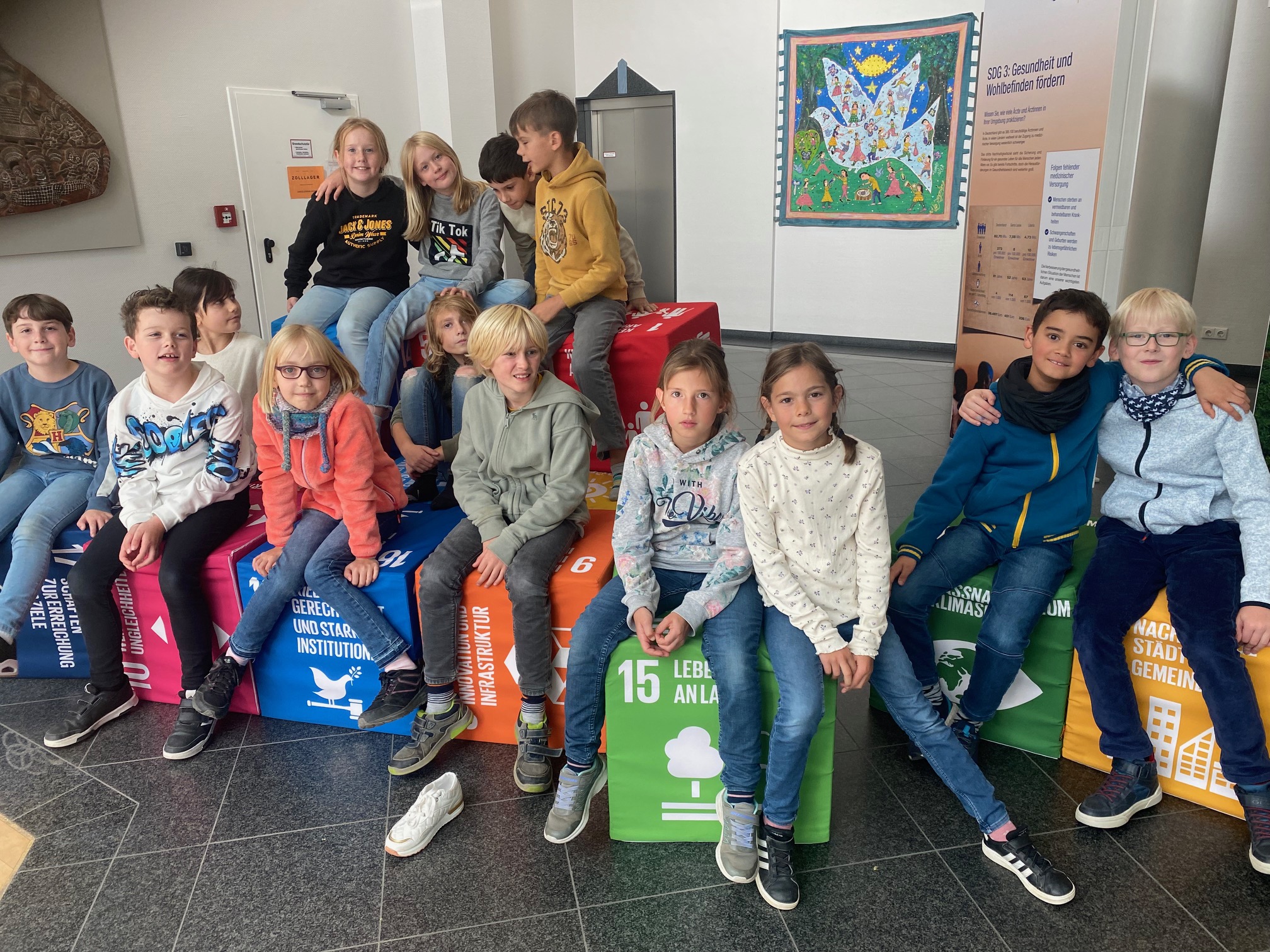 Schon fast 60 Jahre leistet action medeor weltweit in Notsituationen und bei Katastrophen Hilfe. Die beiden vierten Schuljahre waren im Oktober dort zu Besuch, um mehr über den Einsatz und die Hilfsmaßnahmen zu erfahren: 64 Länder konnte action medeor bereits durch Hilfsprojekte vor Ort und kurzfristige Katastrophenhilfe unterstützen. Auch bestaunten die Kinder das große Lager mit Hilfsgütern und erfuhren etwas über die tragbaren medizinischen Geräte, die eine bessere medizinische Versorgung vor Ort ermöglichen. Zudem lernten die Kinder etwas über die Nachhaltigkeitsziele 6 und 14: „Ausreichend Wasser in bester Qualität“ und „Tiere unter Wasser schützen“. Auch für diese Ziele setzt sich action medeor ein. Unser Besuch war sehr beeindruckend. Unser Ausflug endete anschließend mit einem Besuch auf den nahegelegenen Spielplätzen.