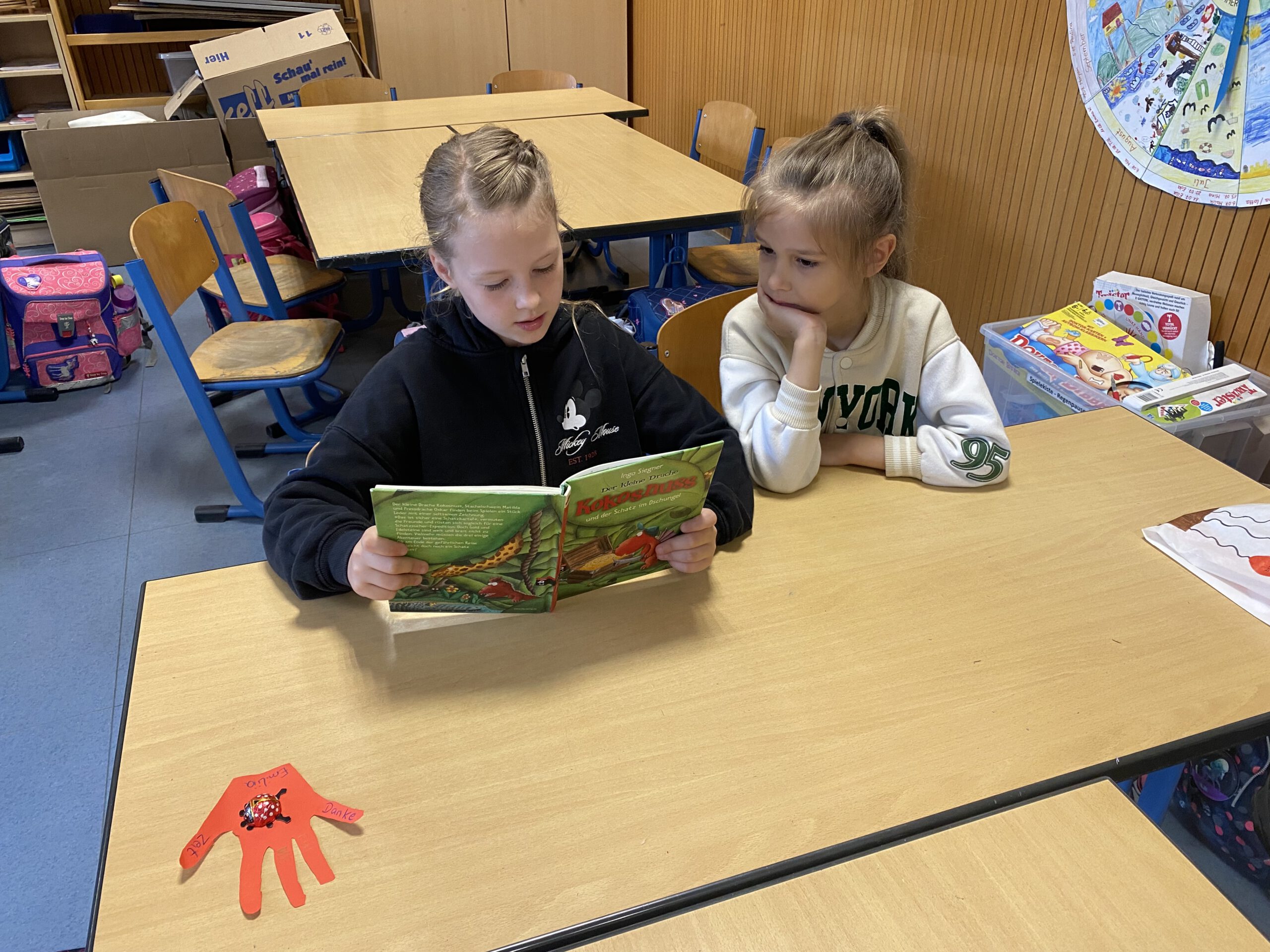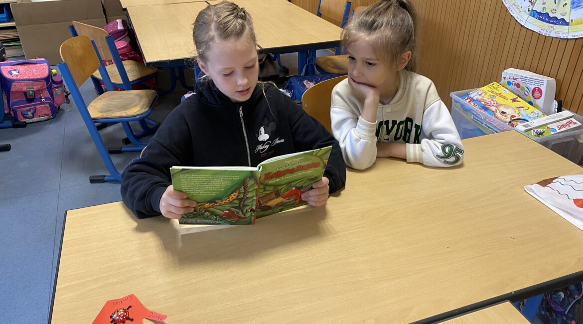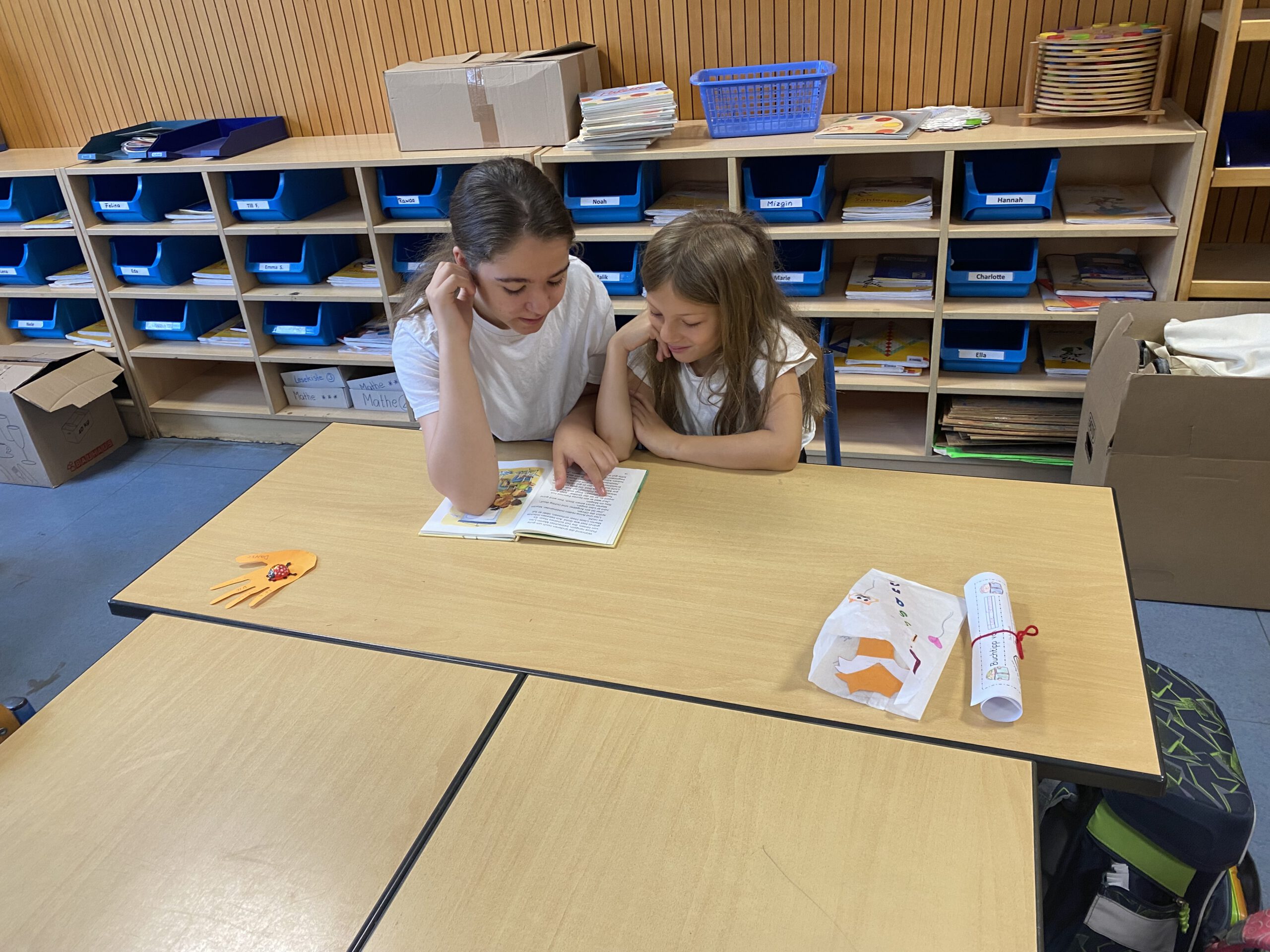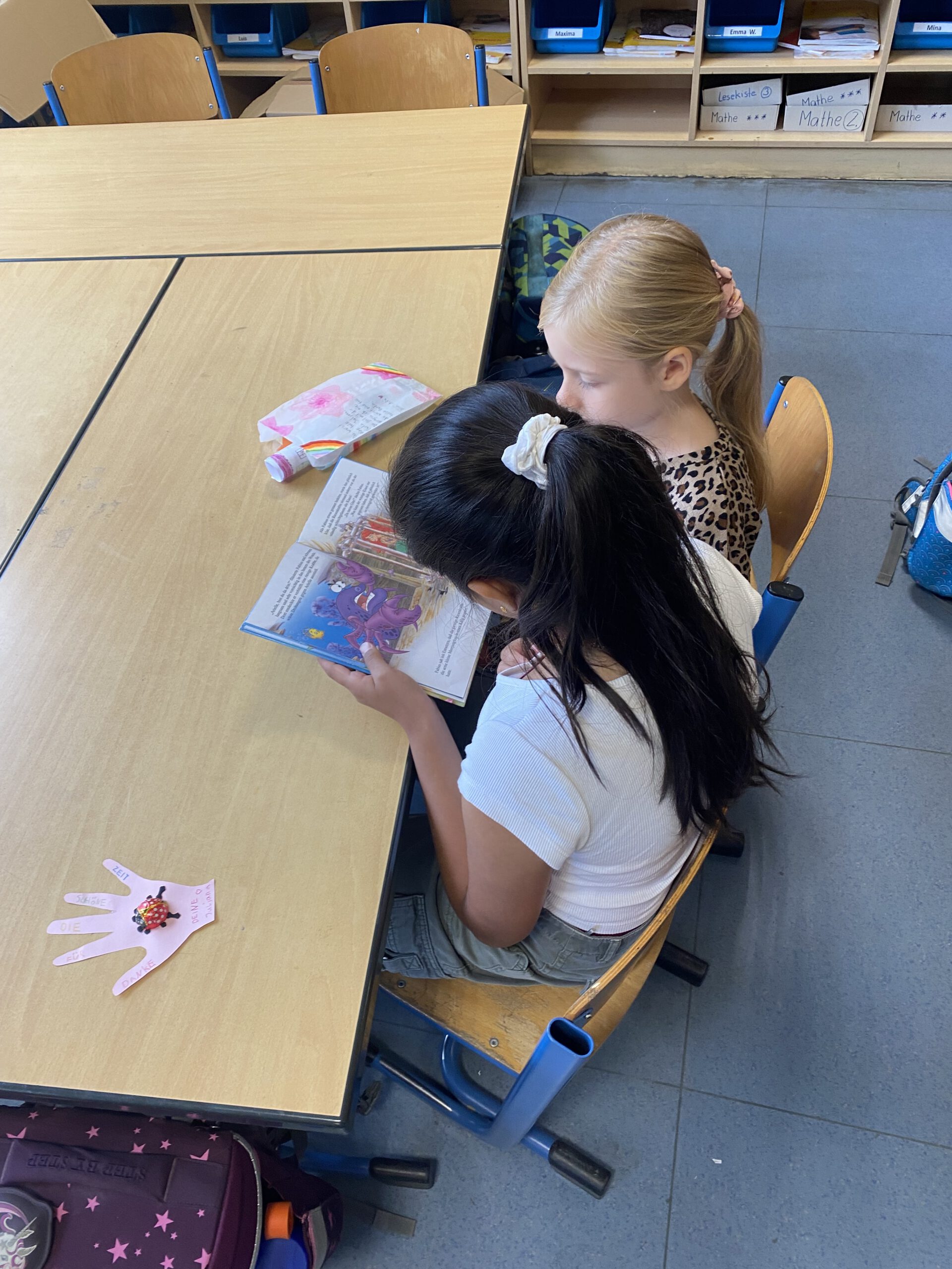 In der letzten Schulwoche trafen sich auch die ersten und vierten Klassen, damit die Paten Zeit hatten, in Ruhe voneinander Abschied zu nehmen. In einer schönen Vorlesestunde für die Erstklässler traf man sich, um Geschichten zu hören und Buchtipps zu bekommen. Selbstgebastelte Geschenke wurden ausgetauscht. Die Erstklässler werden ihre großen Paten vermissen!