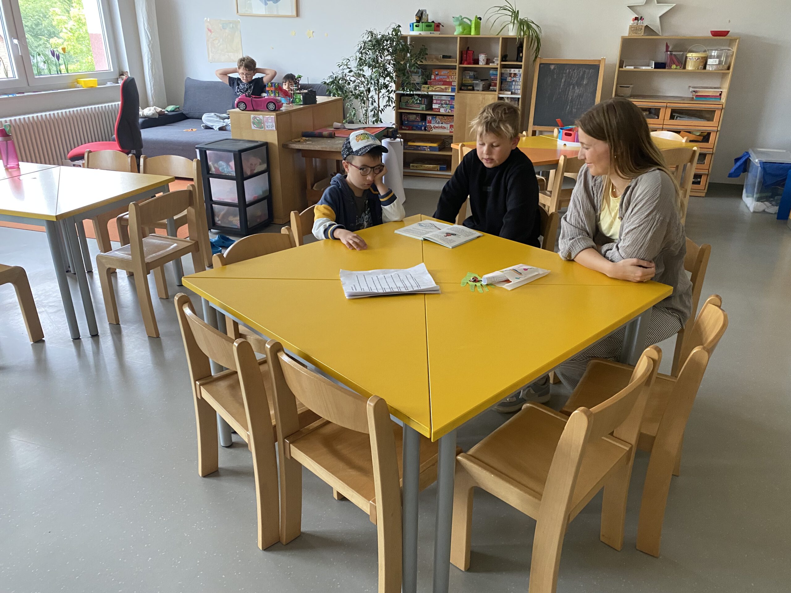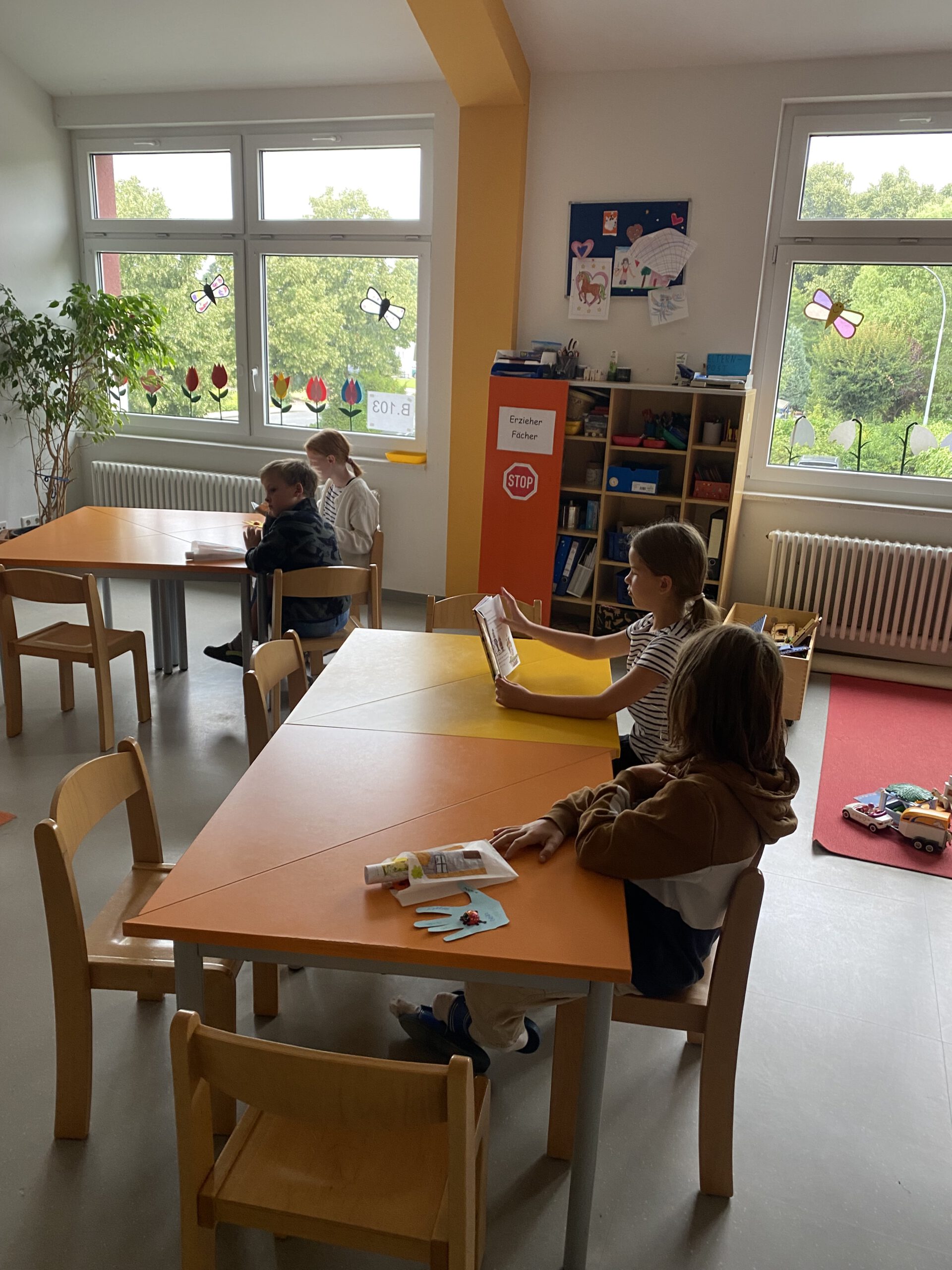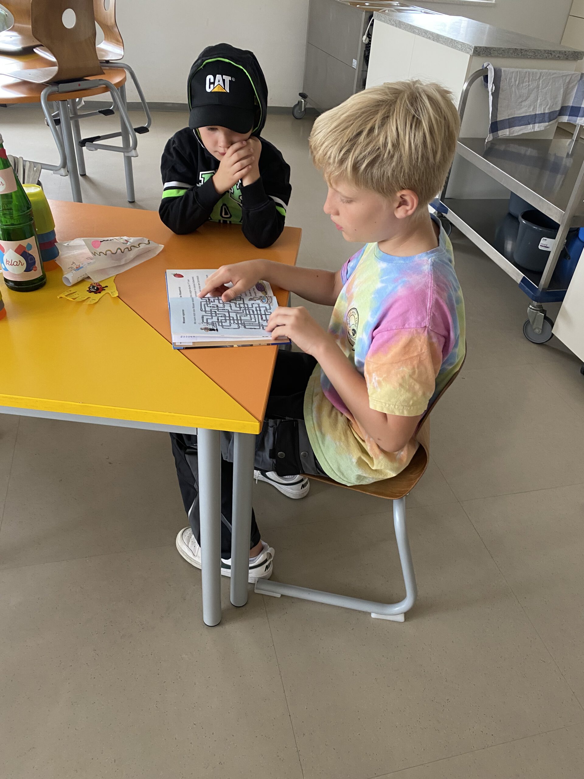 In der letzten Schulwoche trafen sich auch die ersten und vierten Klassen, damit die Paten Zeit hatten, in Ruhe voneinander Abschied zu nehmen. In einer schönen Vorlesestunde für die Erstklässler traf man sich, um Geschichten zu hören und Buchtipps zu bekommen. Selbstgebastelte Geschenke wurden ausgetauscht. Die Erstklässler werden ihre großen Paten vermissen!