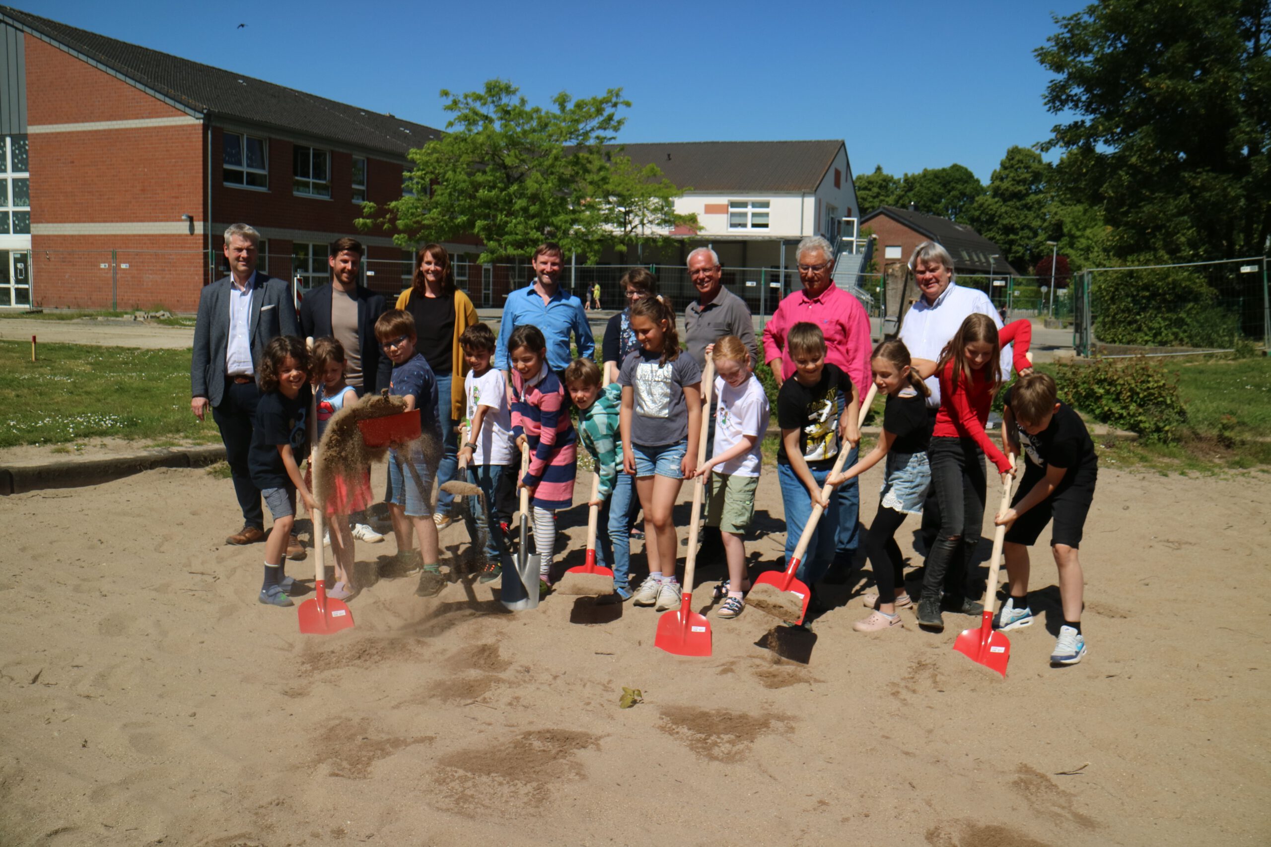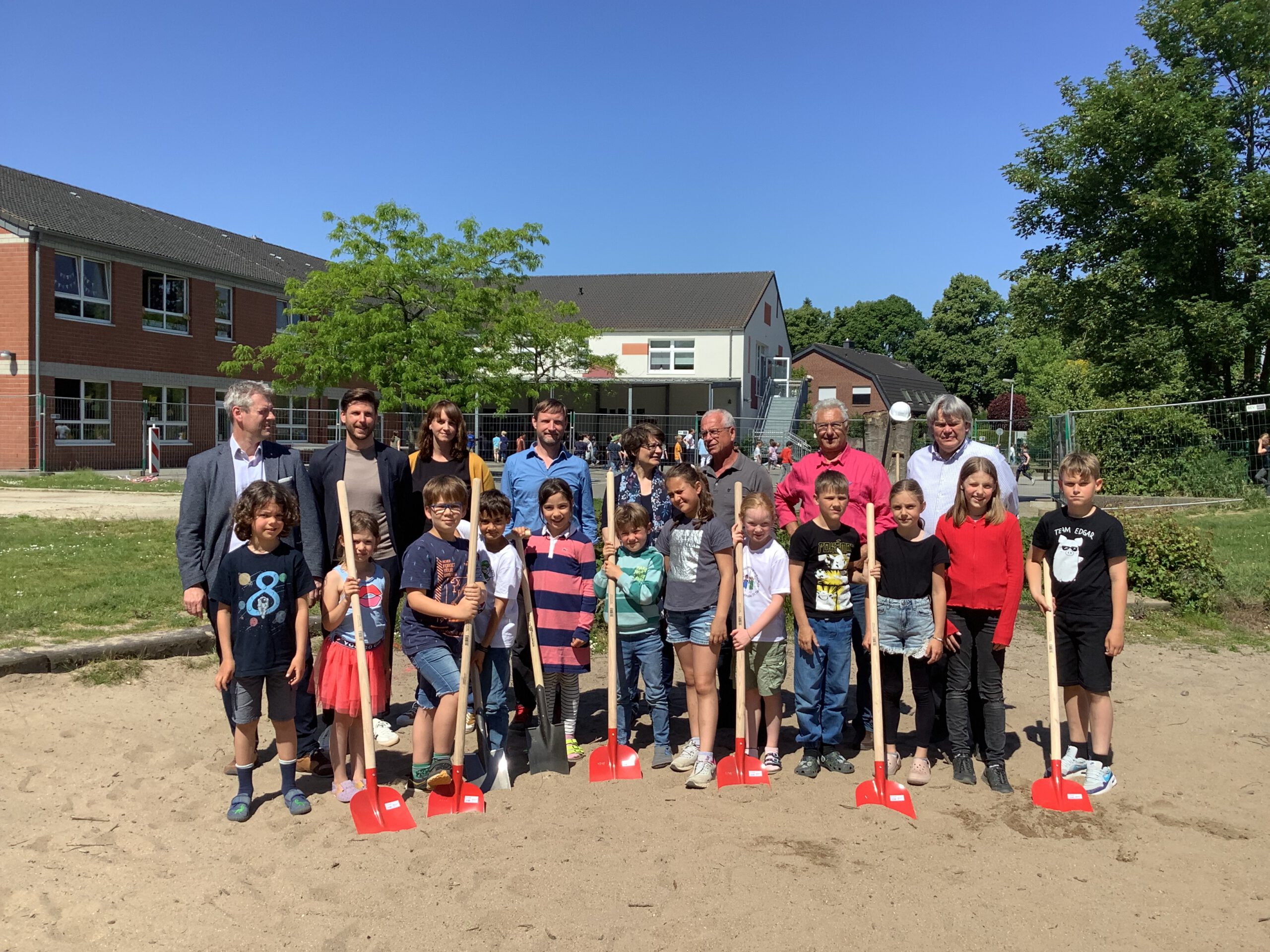 Nun ist es endlich soweit! Am Mittwoch, den 31.05.2023 gab es nun den offiziellen Spatenstich für den Erweiterungsbau unserer Schule. Vertreter aus Politik, Schule und Verwaltung nahmen gemeinsam einen symbolischen Spatenstich vor. Auch aus der Schülerschaft waren einige Kinder mit dabei! Hoffen wir, dass es keine Verzögerungen geben wird und wir Ende August 2024 den Erweiterungsbau beziehen dürfen.