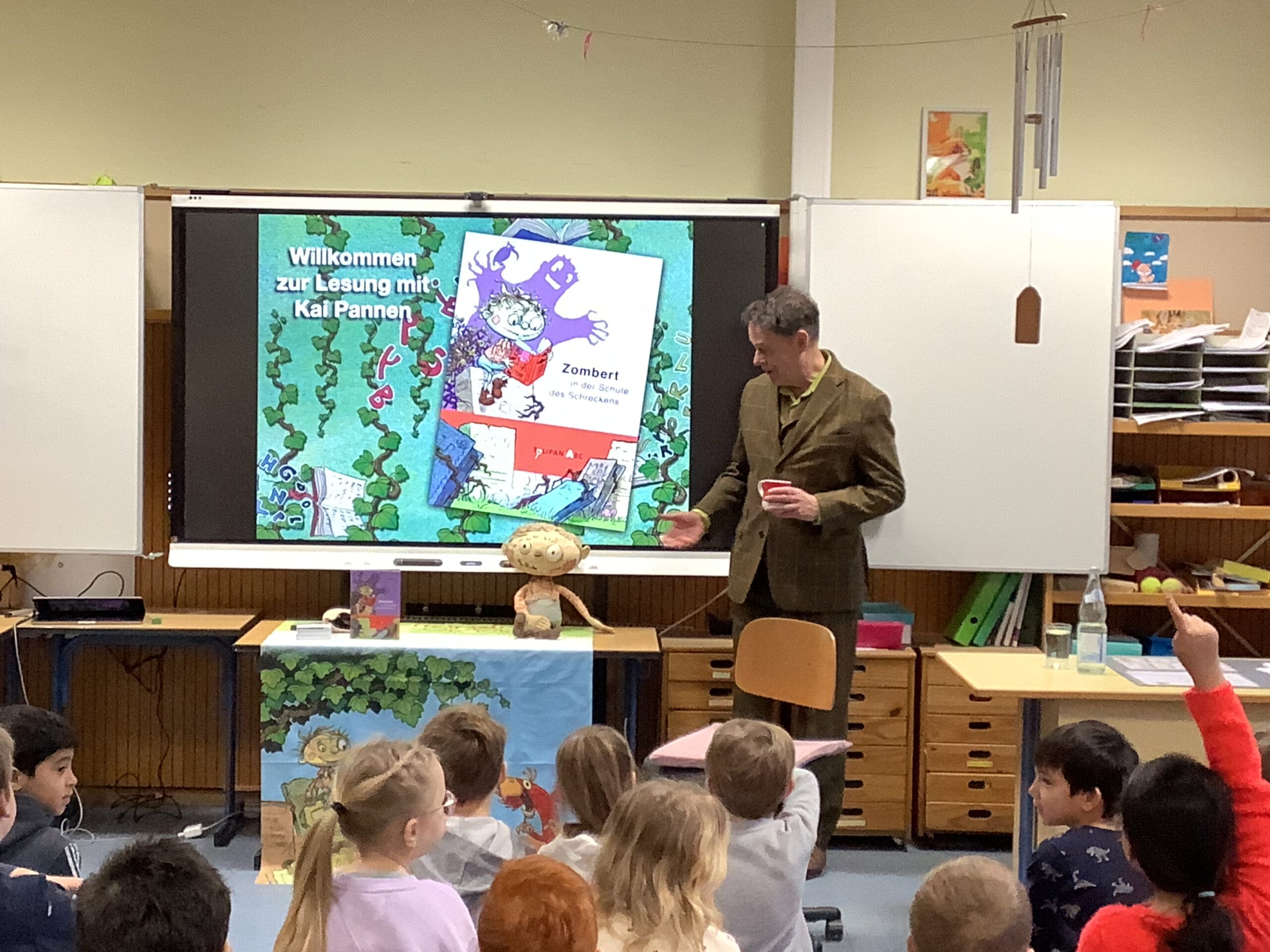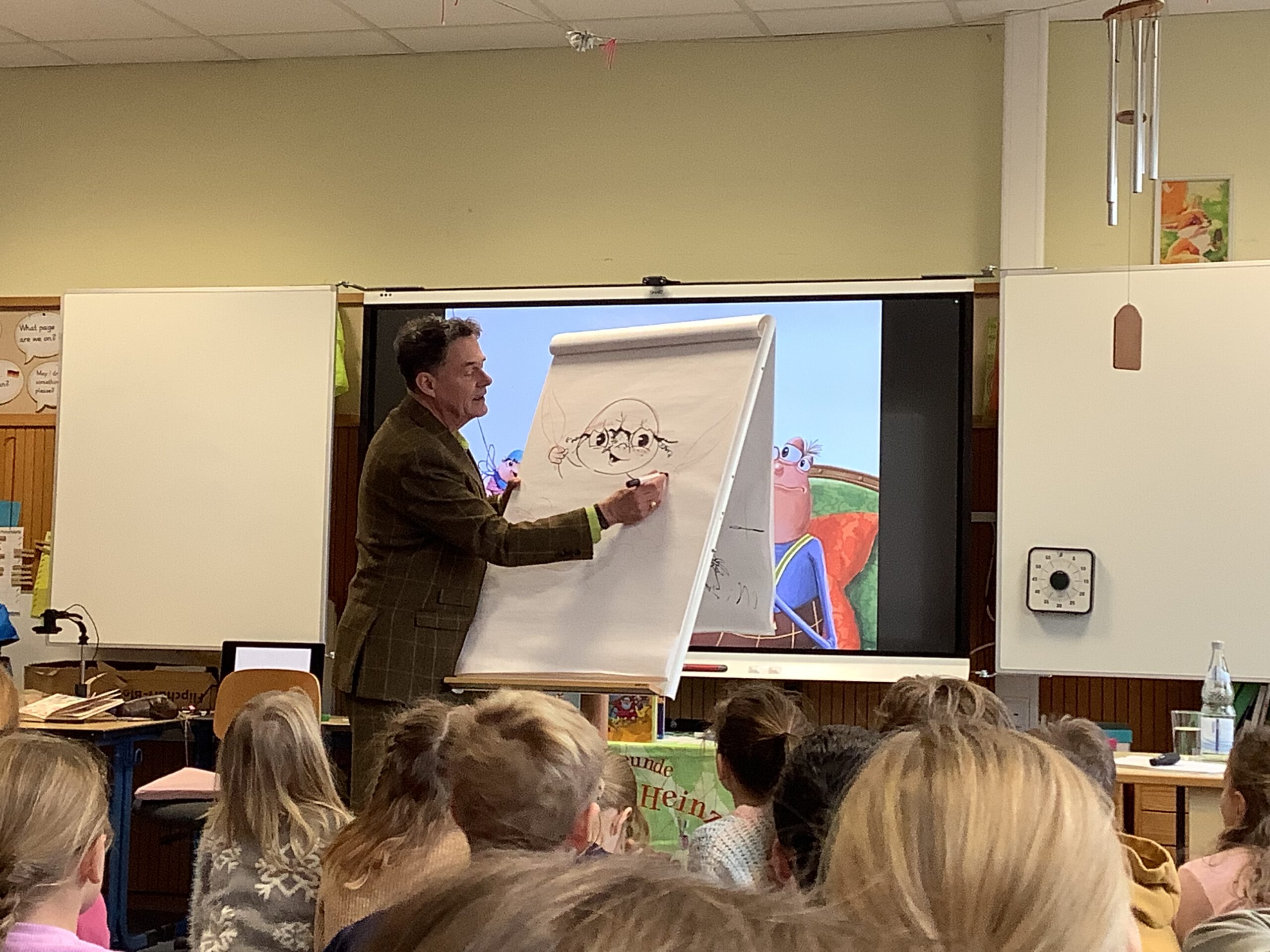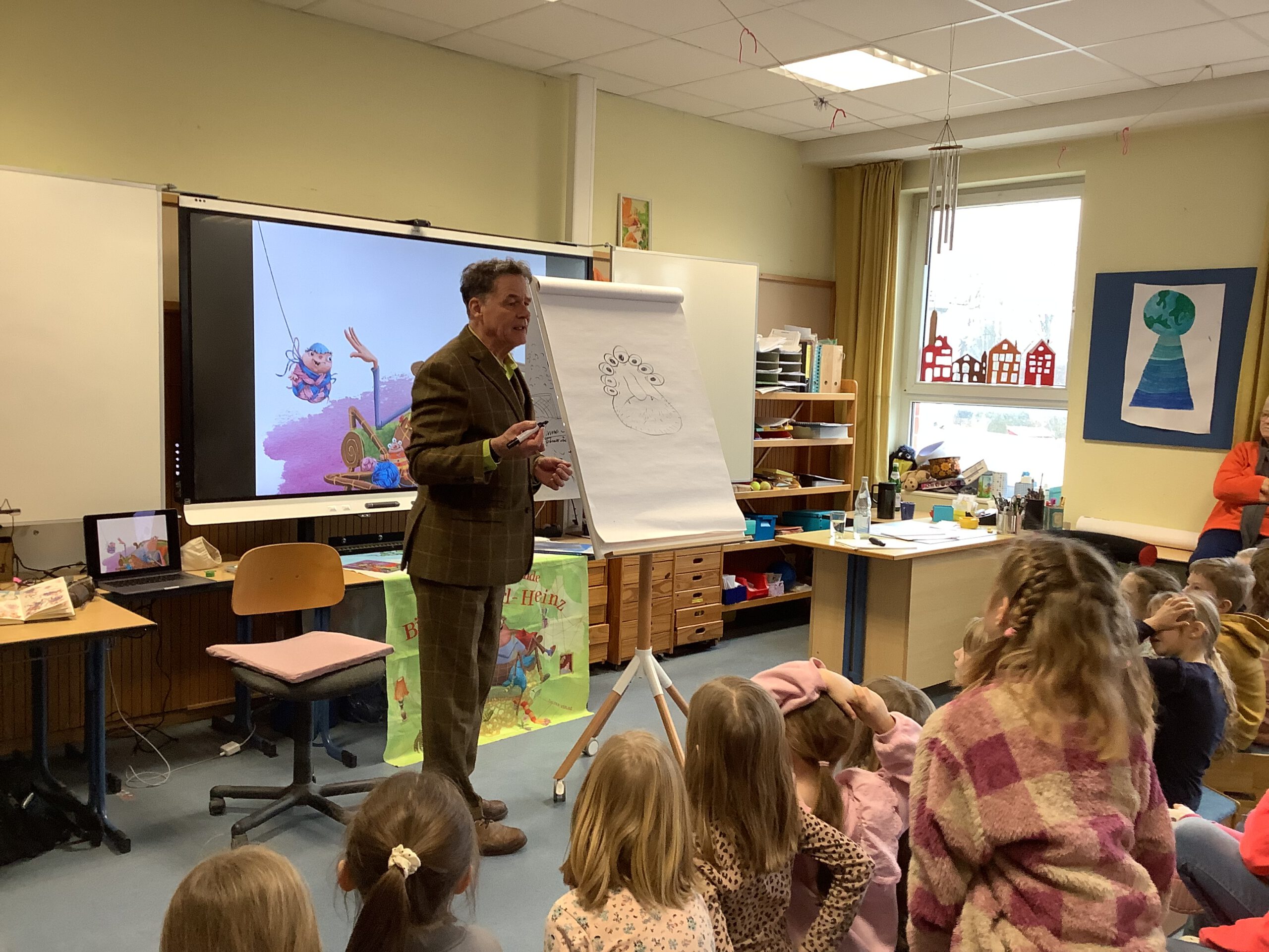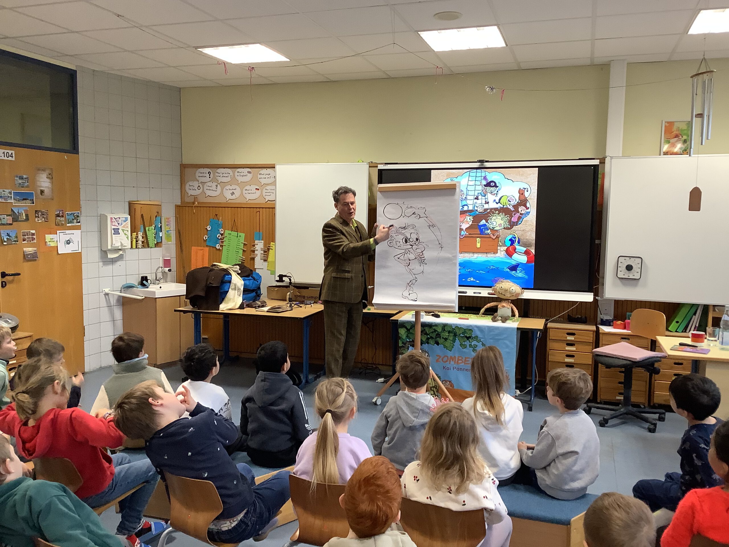 Wann hat man schon mal die Gelegenheit einem Illustrator beim Zeichnen zuzuschauen oder einem Kinderbuchautor persönlich zu begegnen? Am Dienstag, den 04.02. war Kai Pannen, der Kinderbuchautor und Illustrator der Kinderbücher rund um Zombert, der Fliege Bisy und der Spinne Karl-Heinz bei uns zu Besuch. In mehreren Lesungen – abgestimmt auf die Klassenstufen – las er aus seinen Büchern vor und ließ dabei seine Hauptakteure mit all ihrem Witz lebendig werden. In Windeseile zeichnete er, unterstützt durch die kreativen Ideen der Kinder, witzige Illustrationen zu seinen Büchern. Dabei lernten die Kinder auch, wie ein solches Bild entsteht. Zum Schluss wurden die neu angeschafften Bücher für die Bücherei von ihm signiert. Das war ein abwechslungsreicher und spaßiger Vormittag für alle! Vielen Dank fürs Kommen, Herr Pannen!