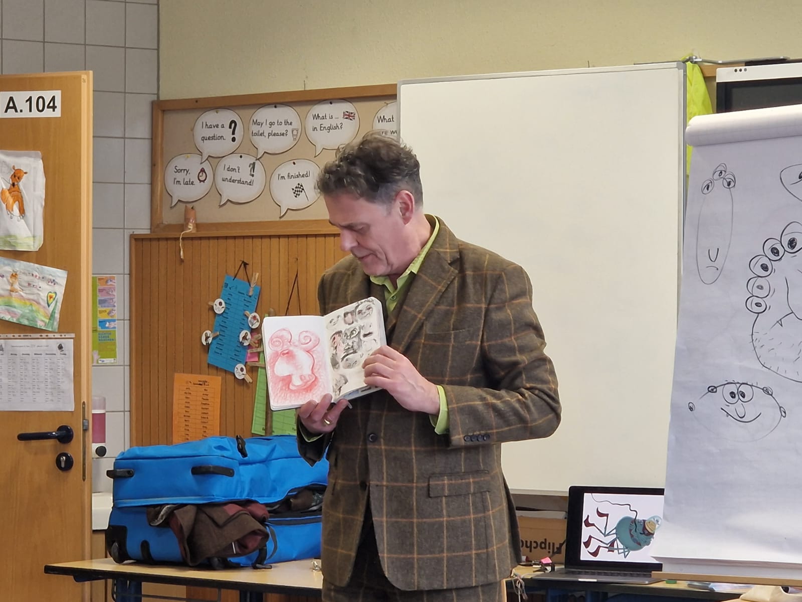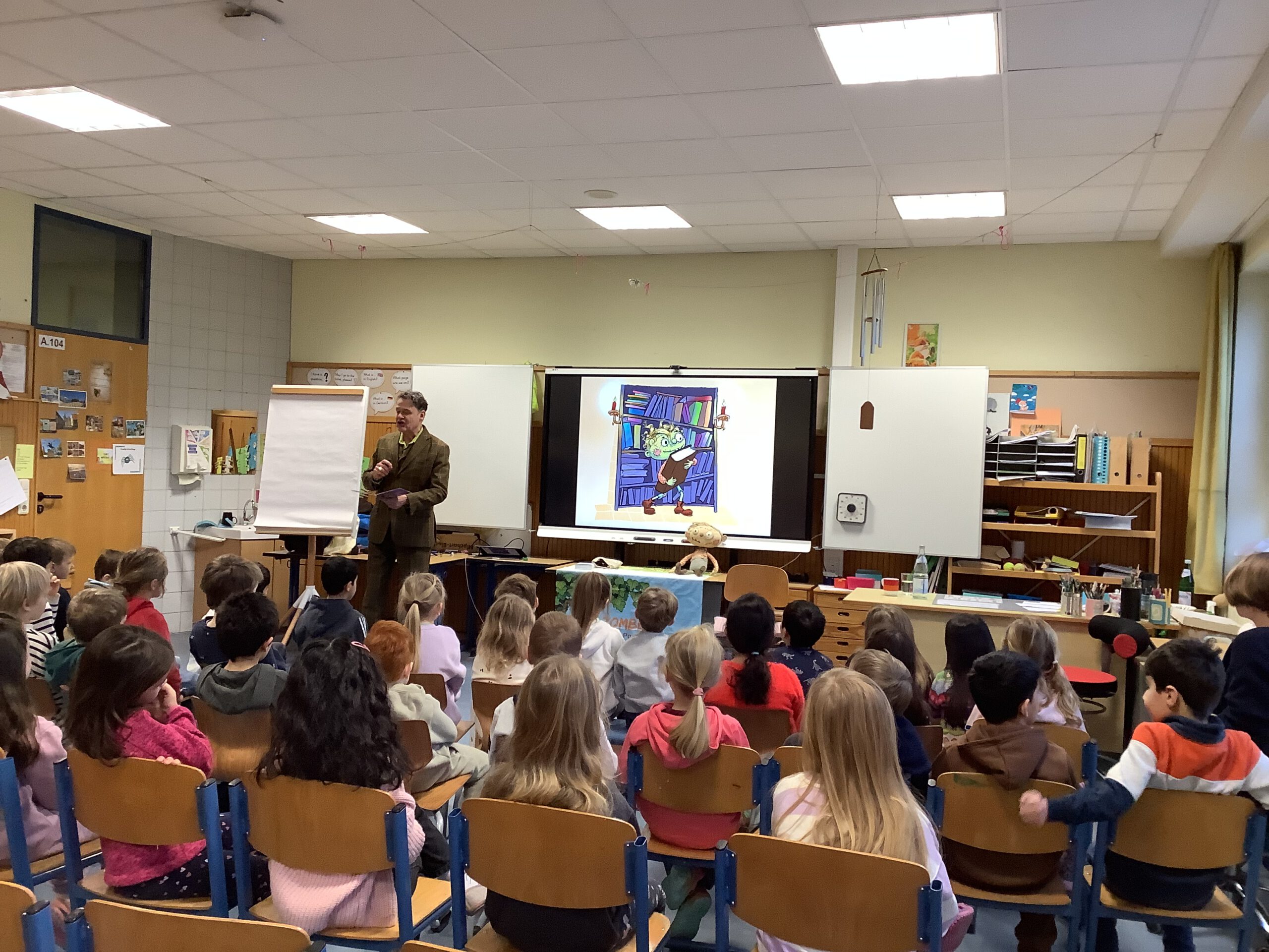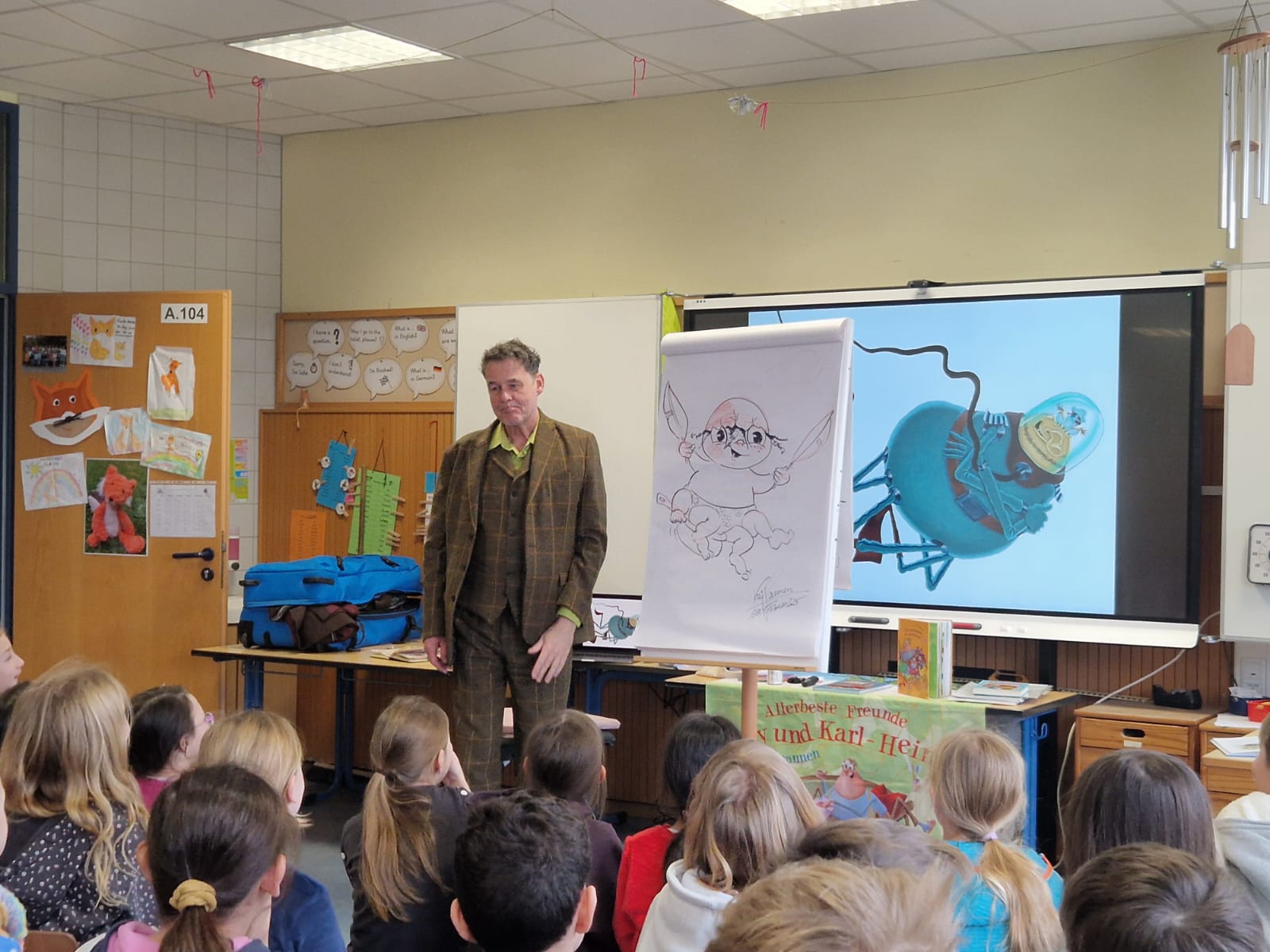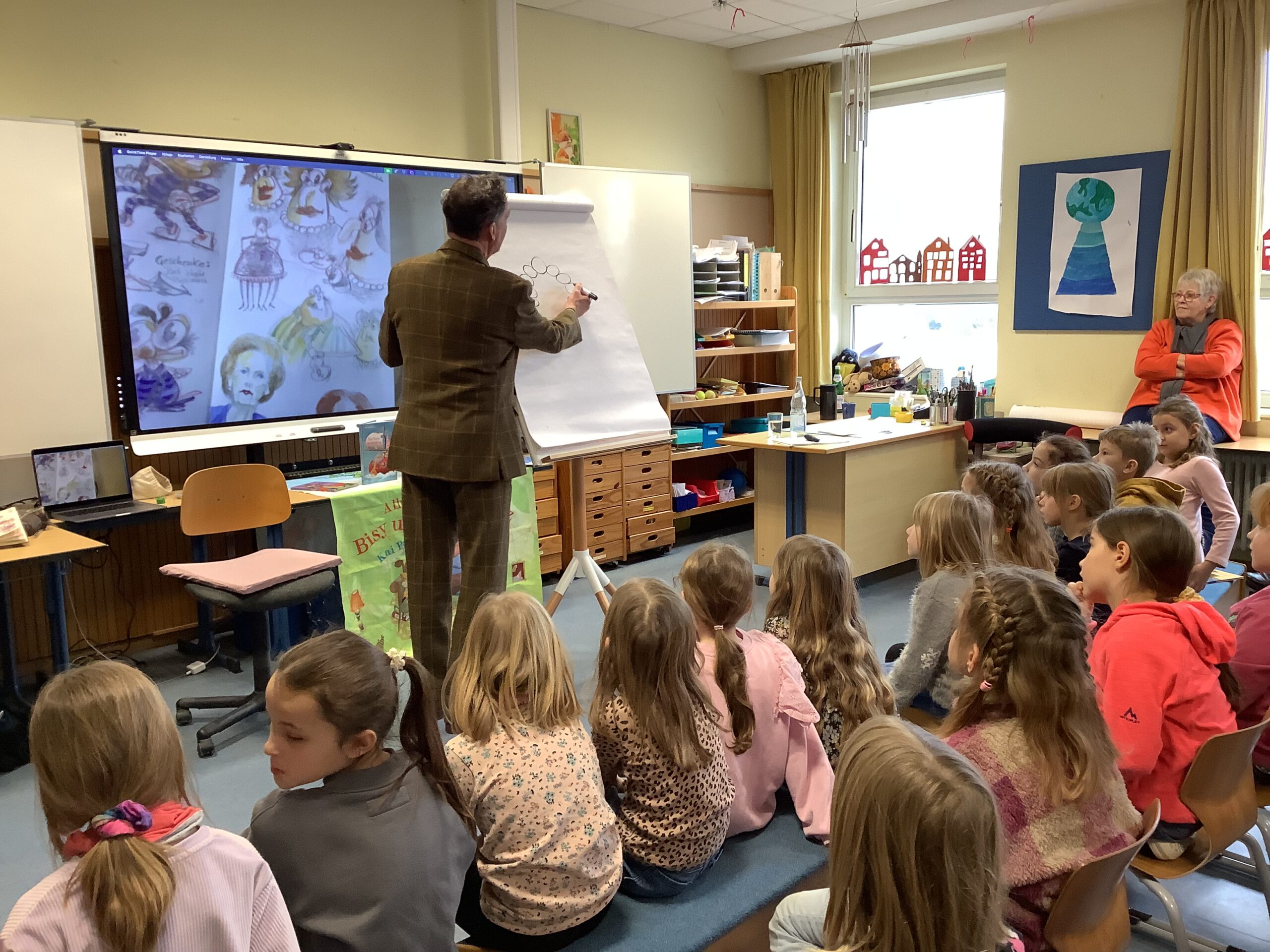 Wann hat man schon mal die Gelegenheit einem Illustrator beim Zeichnen zuzuschauen oder einem Kinderbuchautor persönlich zu begegnen? Am Dienstag, den 04.02. war Kai Pannen, der Kinderbuchautor und Illustrator der Kinderbücher rund um Zombert, der Fliege Bisy und der Spinne Karl-Heinz bei uns zu Besuch. In mehreren Lesungen – abgestimmt auf die Klassenstufen – las er aus seinen Büchern vor und ließ dabei seine Hauptakteure mit all ihrem Witz lebendig werden. In Windeseile zeichnete er, unterstützt durch die kreativen Ideen der Kinder, witzige Illustrationen zu seinen Büchern. Dabei lernten die Kinder auch, wie ein solches Bild entsteht. Zum Schluss wurden die neu angeschafften Bücher für die Bücherei von ihm signiert. Das war ein abwechslungsreicher und spaßiger Vormittag für alle! Vielen Dank fürs Kommen, Herr Pannen!