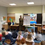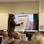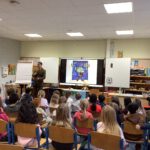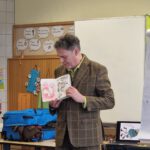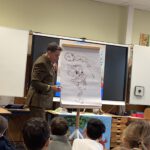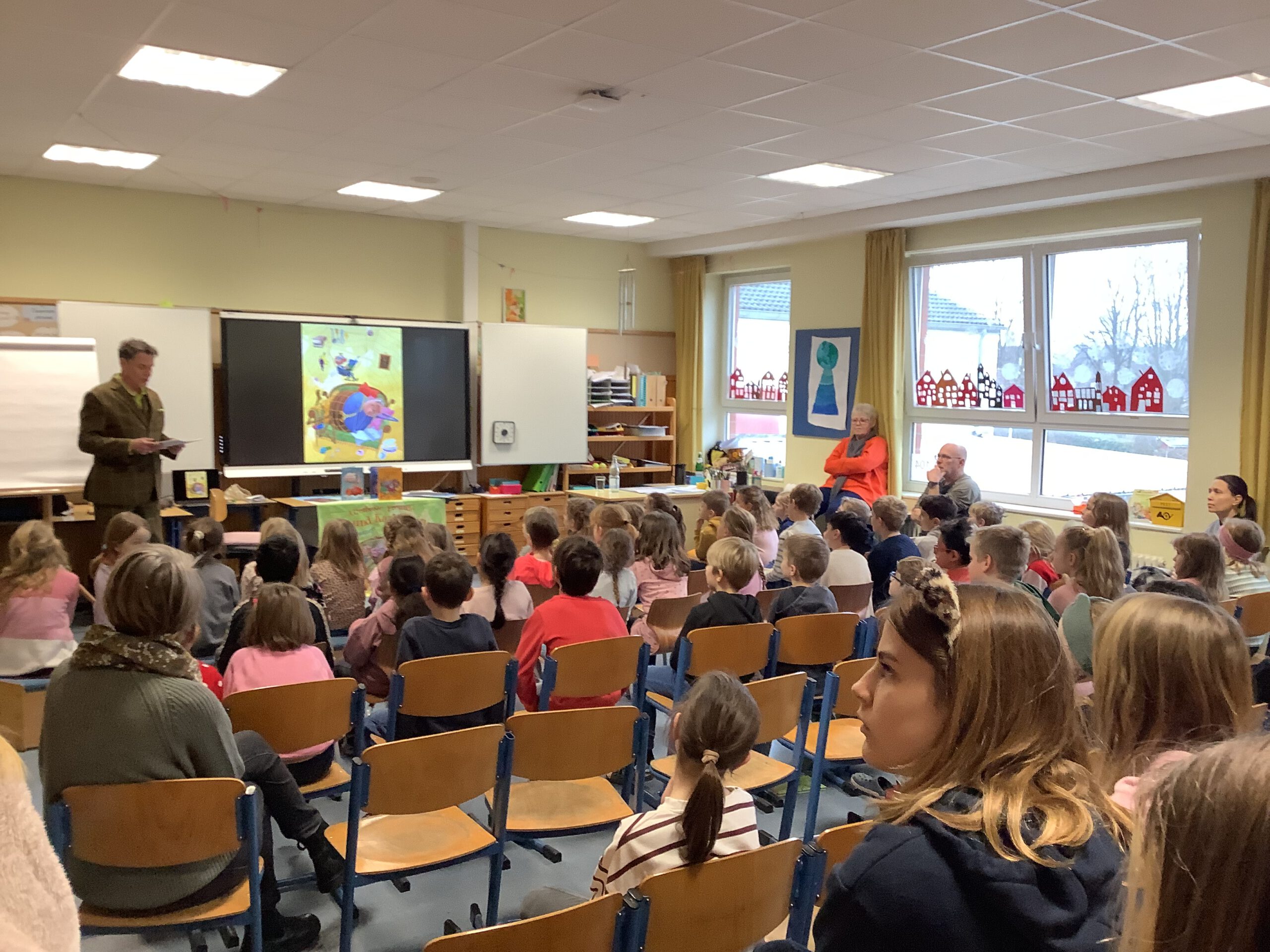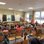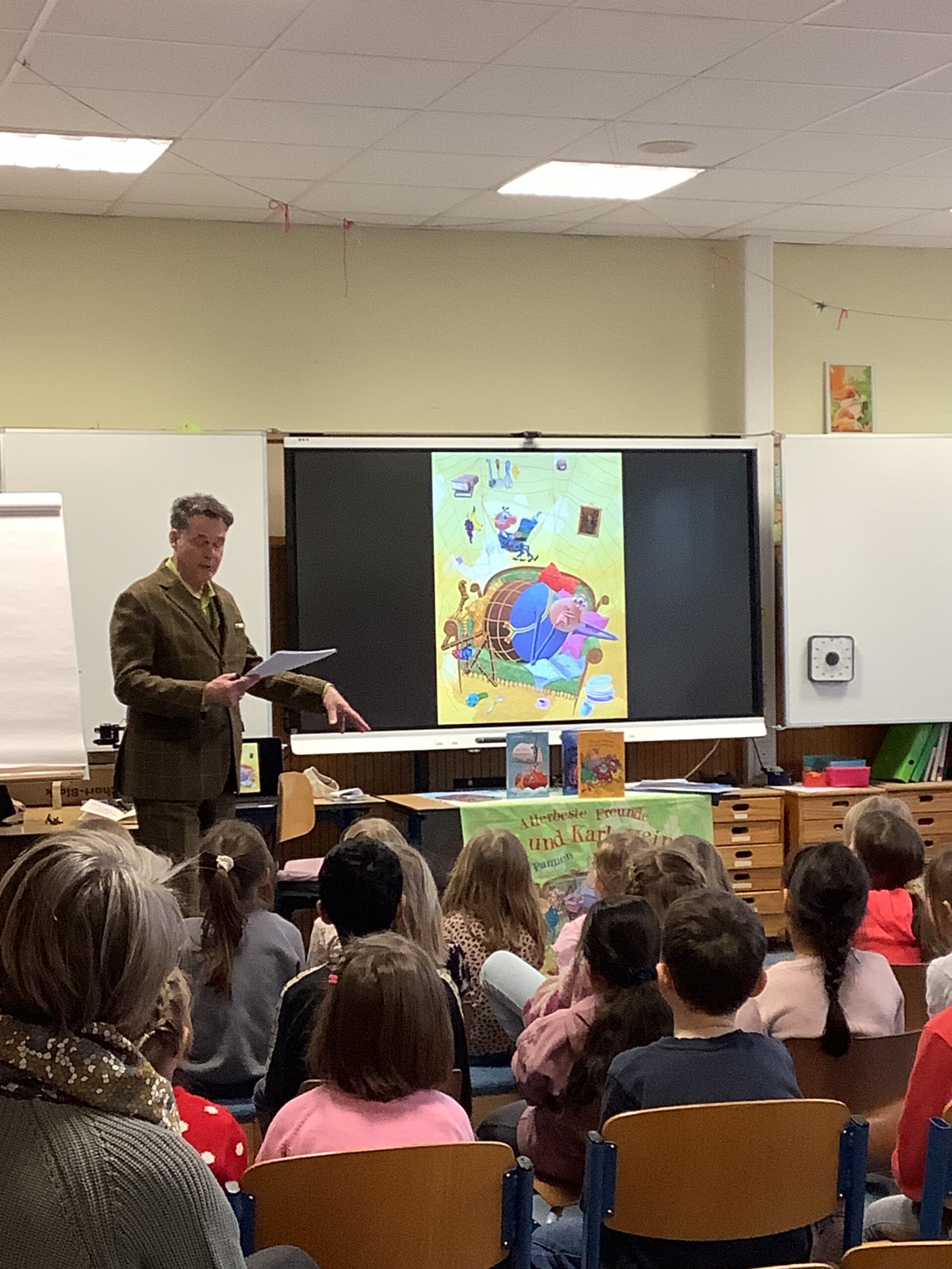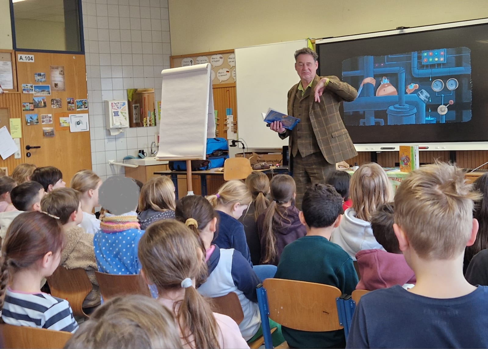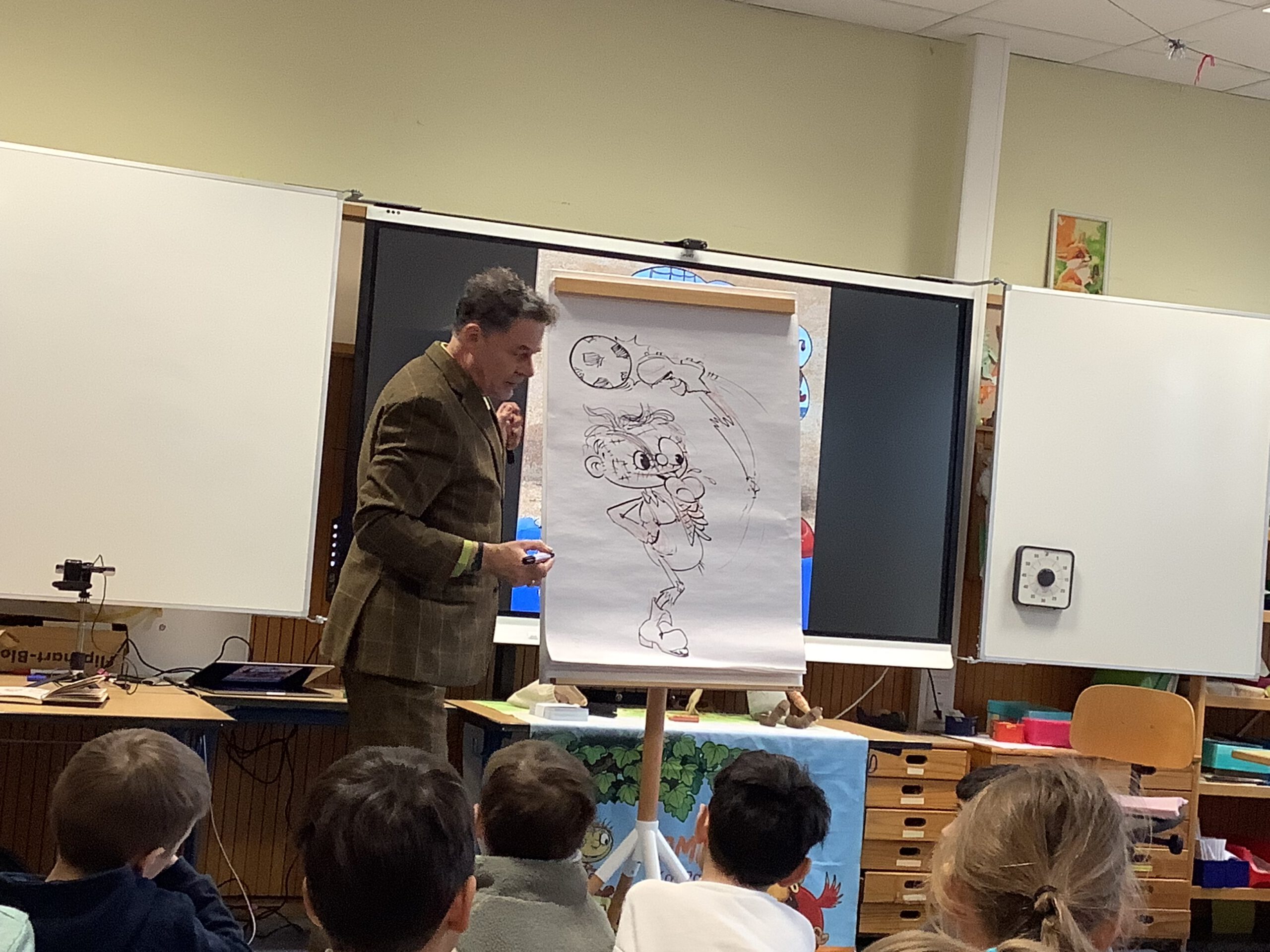 Wann hat man schon mal die Gelegenheit einem Illustrator beim Zeichnen zuzuschauen oder einem Kinderbuchautor persönlich zu begegnen? Am Dienstag, den 04.02. war Kai Pannen, der Kinderbuchautor und Illustrator der Kinderbücher rund um Zombert, der Fliege Bisy und der Spinne Karl-Heinz bei uns zu Besuch. In mehreren Lesungen – abgestimmt auf die Klassenstufen – las er aus seinen Büchern vor und ließ dabei seine Hauptakteure mit all ihrem Witz lebendig werden. In Windeseile zeichnete er, unterstützt durch die kreativen Ideen der Kinder, witzige Illustrationen zu seinen Büchern. Dabei lernten die Kinder auch, wie ein solches Bild entsteht. Zum Schluss wurden die neu angeschafften Bücher für die Bücherei von ihm signiert. Das war ein abwechslungsreicher und spaßiger Vormittag für alle! Vielen Dank fürs Kommen, Herr Pannen!