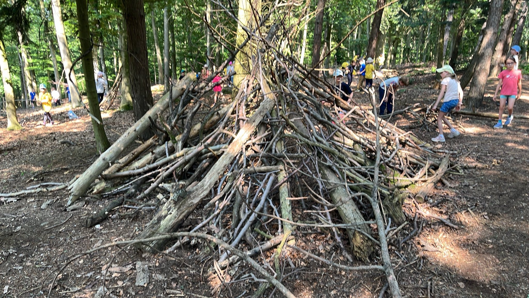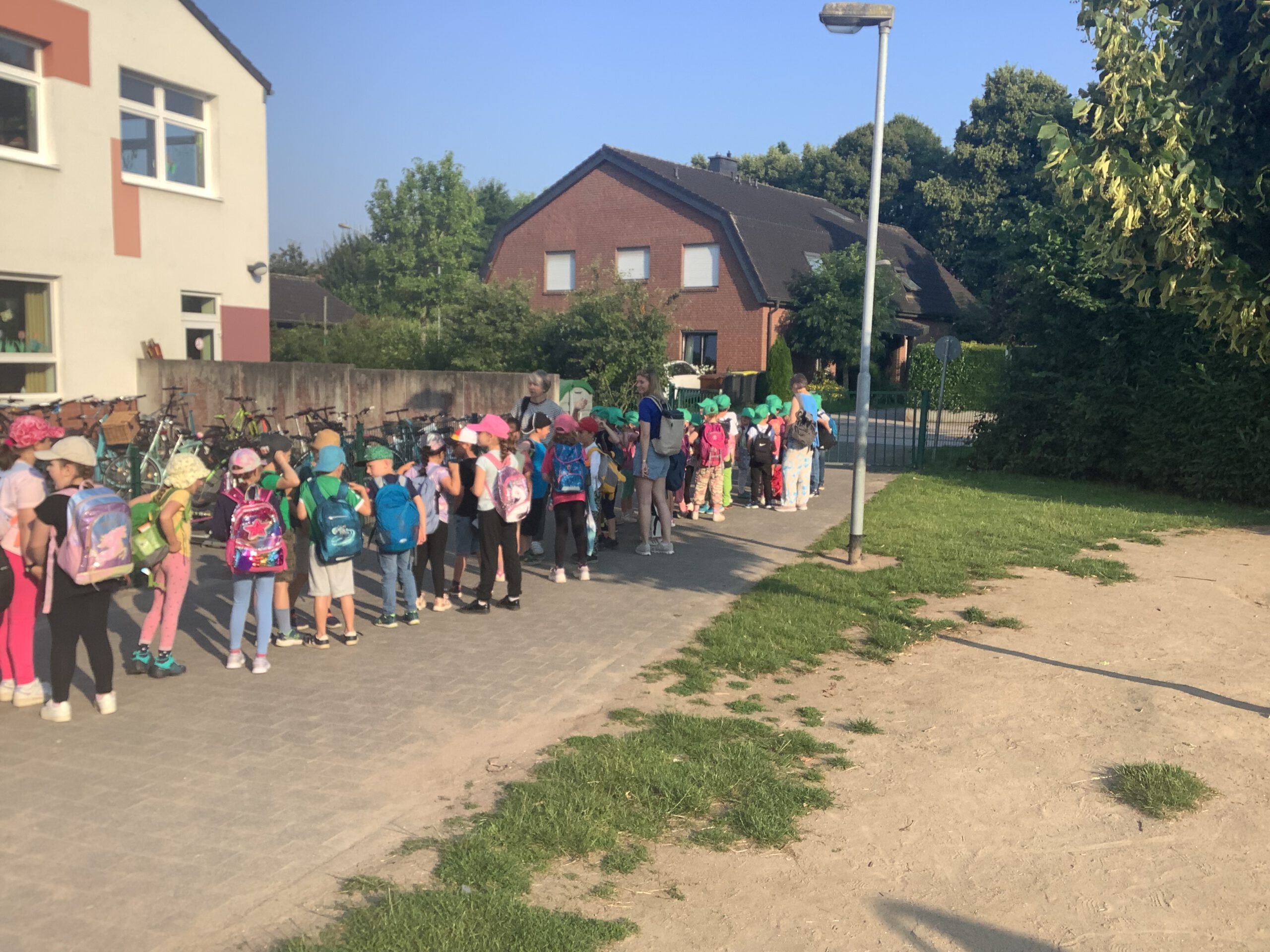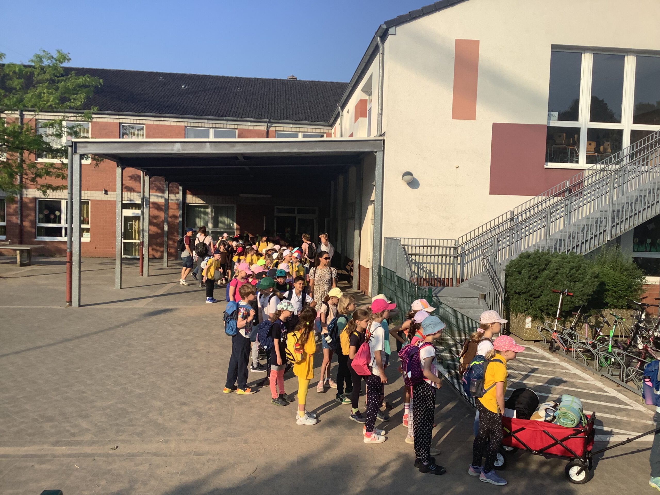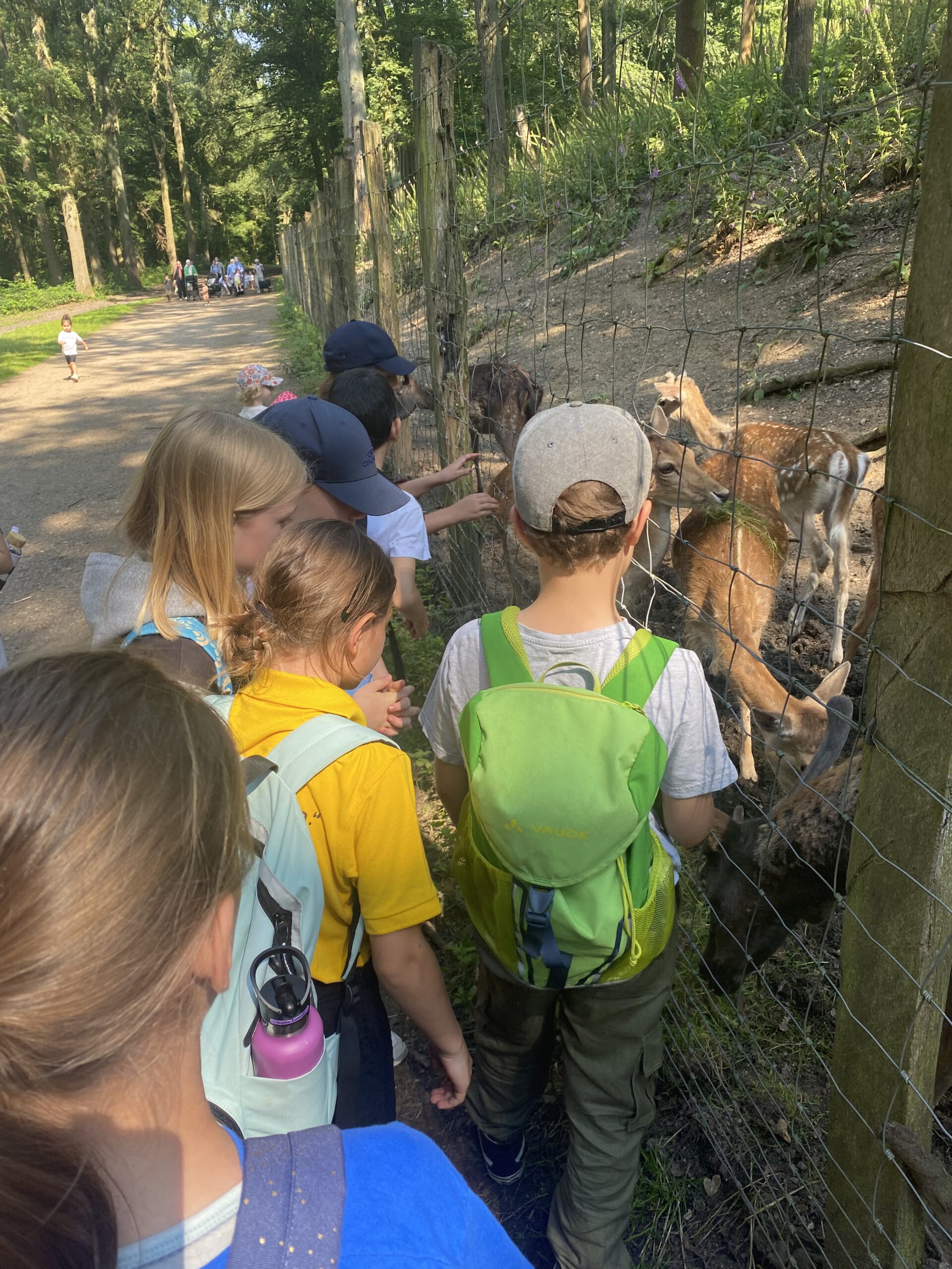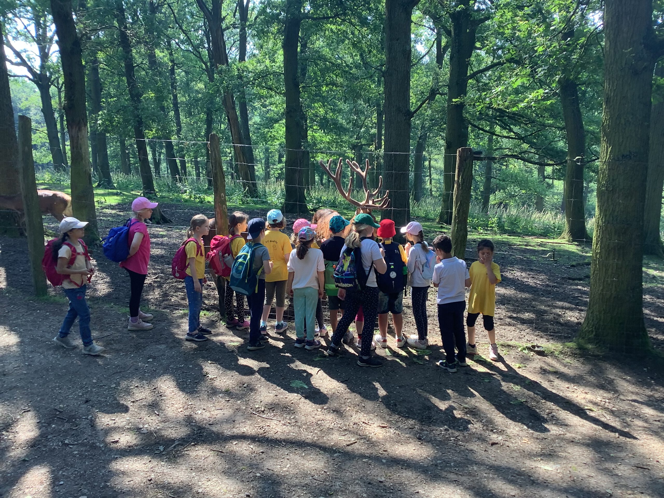 Am Hülser Berg angekommen, machten wir uns bei sommerlichen Temperaturen mit Bollerwagen bepackt auf den Weg hoch zum Hülser Berg, um dort an verschiedenen Stationen wie dem Damwildgehege oder dem Rotwildgehege verschiedene kreative Aufgaben gemeinsam zu erfüllen. Wir konnten gemeinsam viel erleben und spielen. Dabei wanderten wir gemeinsam ganze 10 km! Was für ein schöner Sommertag im Grünen. Es hat allen viel Spaß gemacht! Danke sagen die Kinder und der Förderverein für die große Spendenbereitschaft in der Elternschaft, die diesen Ausflug erst möglich gemacht hat.