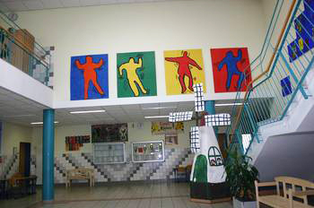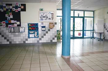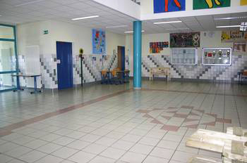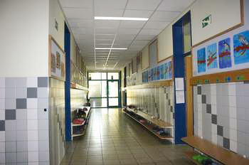 Unser Schulgebäude Im Erdgeschoss unserer Schule befinden sich die Klassenräume für die Kinder des 1. und 2. Jahrgangs sowie ein Mehrzweckraum mit Küchenzeile, der u.a. auch für den Musikunterricht genutzt wird. Auch zwei Räume der Betreuungsgruppe und der Verwaltungstrakt sind hier zu finden. Der Mittelpunkt des unteren Bereiches ist unser großes Forum. Hier treffen sich die Kinder unserer Schule zu gemeinsamen Aktivitäten.