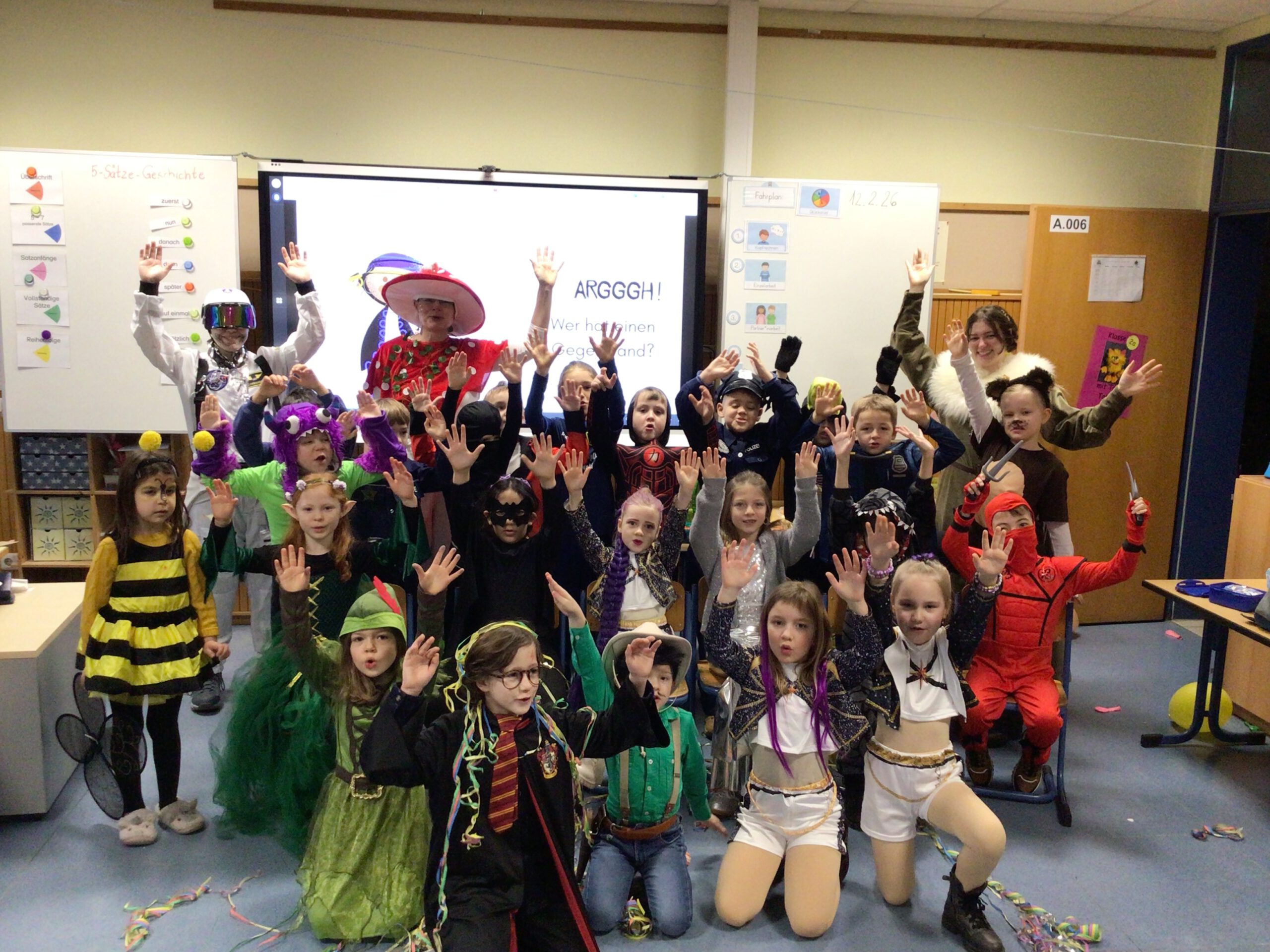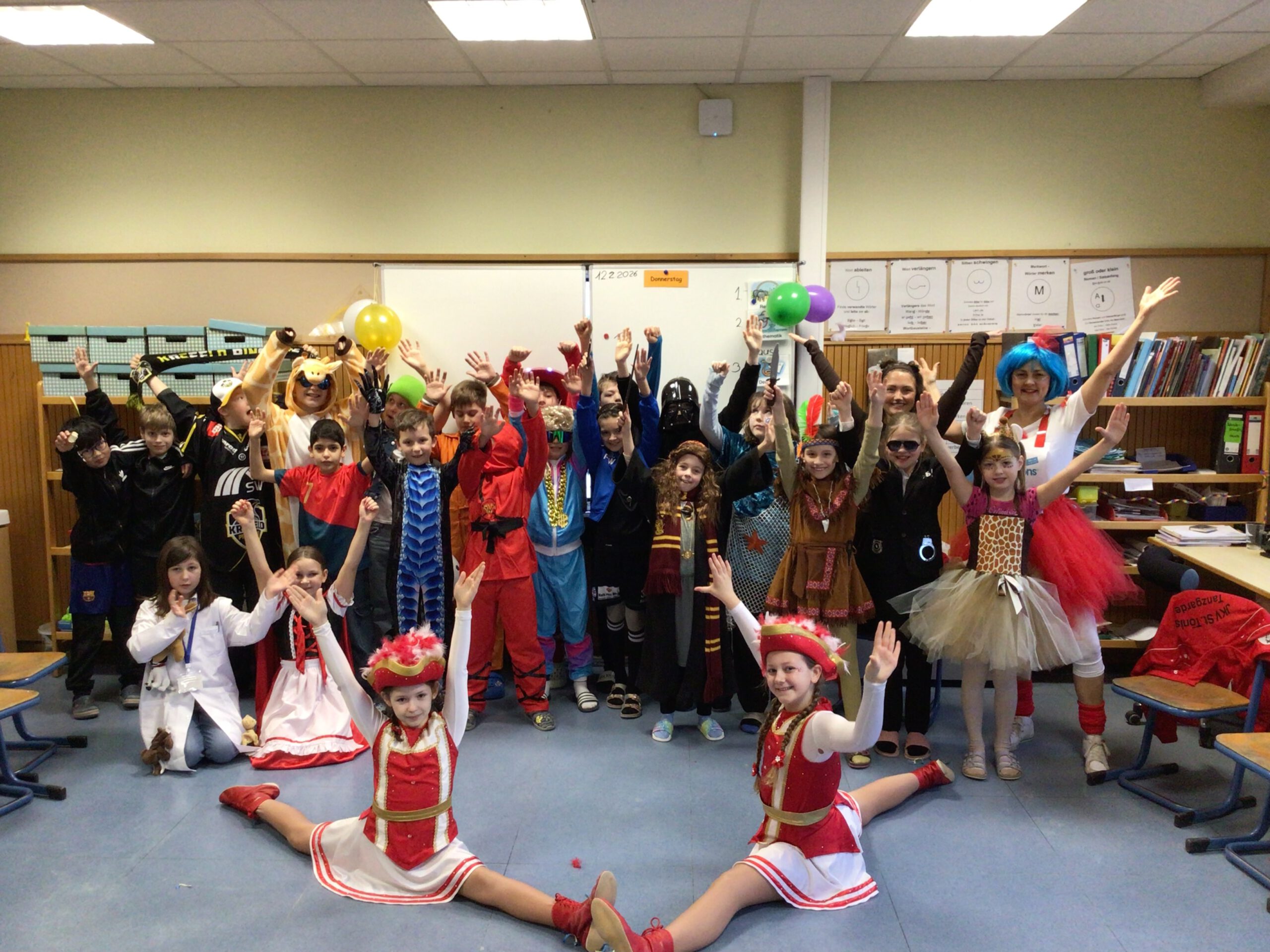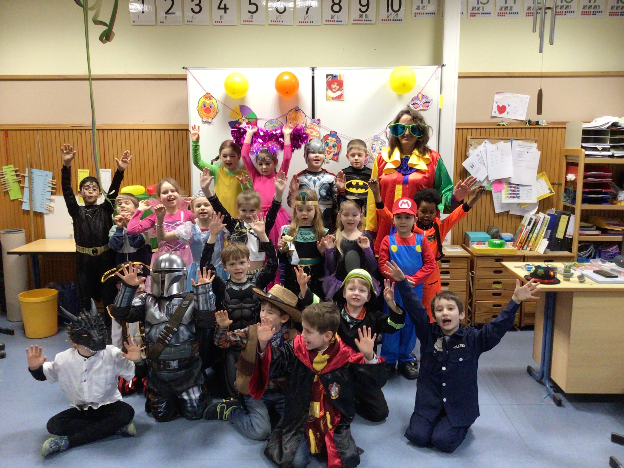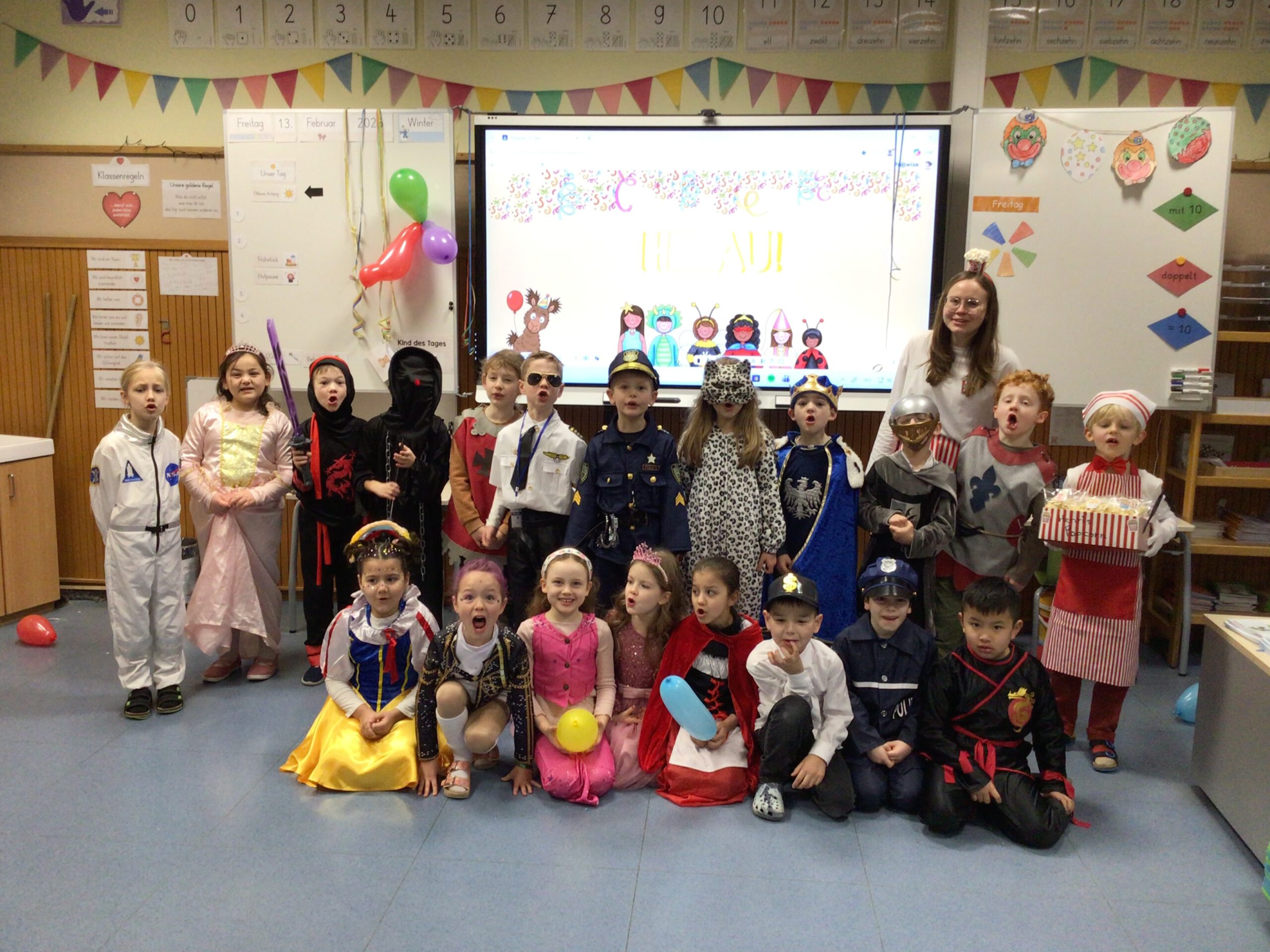 Der Karnevalstag startete traditionell in den Klassenräumen. Dort wurde gemeinsam gefrühstückt, gespielt, getanzt und gelacht. Bei Stopptanz, Reise nach Jerusalem und Kostüm-Modenschauen präsentierten die Kinder stolz ihre Verkleidungen. Auch die Lehrkräfte ließen sich nicht lumpen und erschienen in Kostümen.
