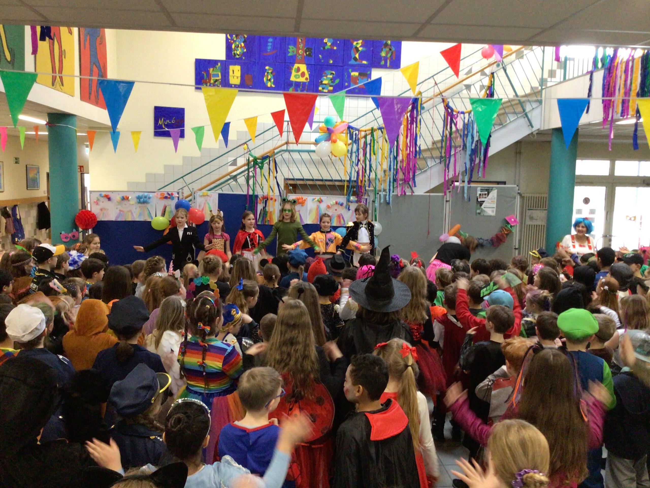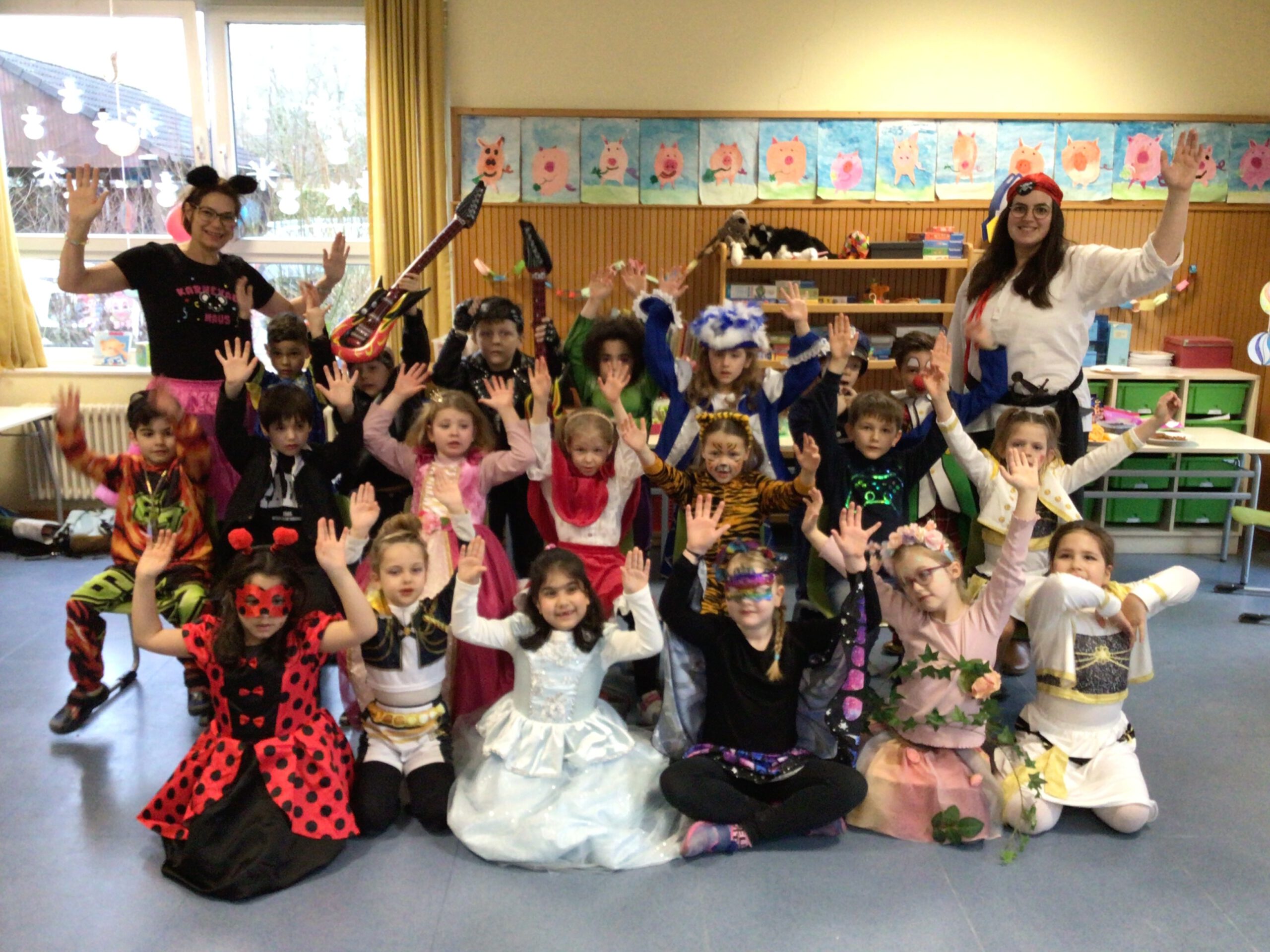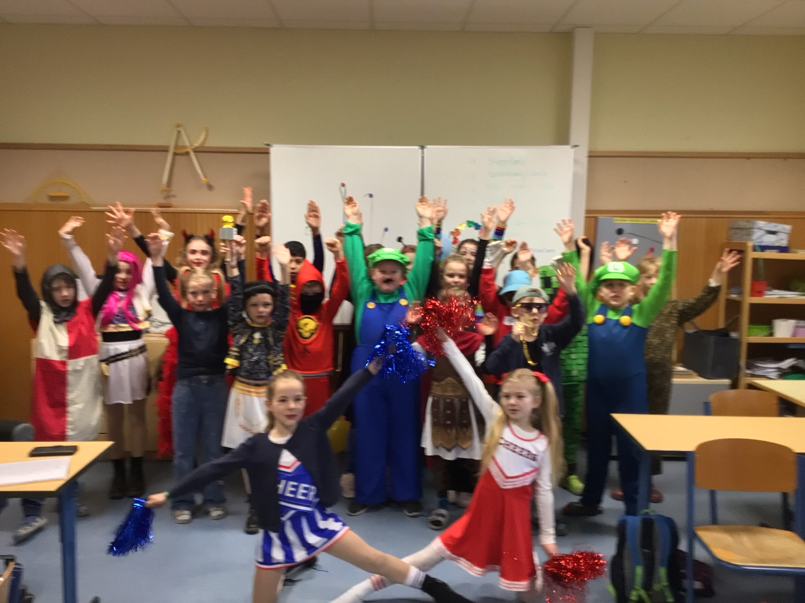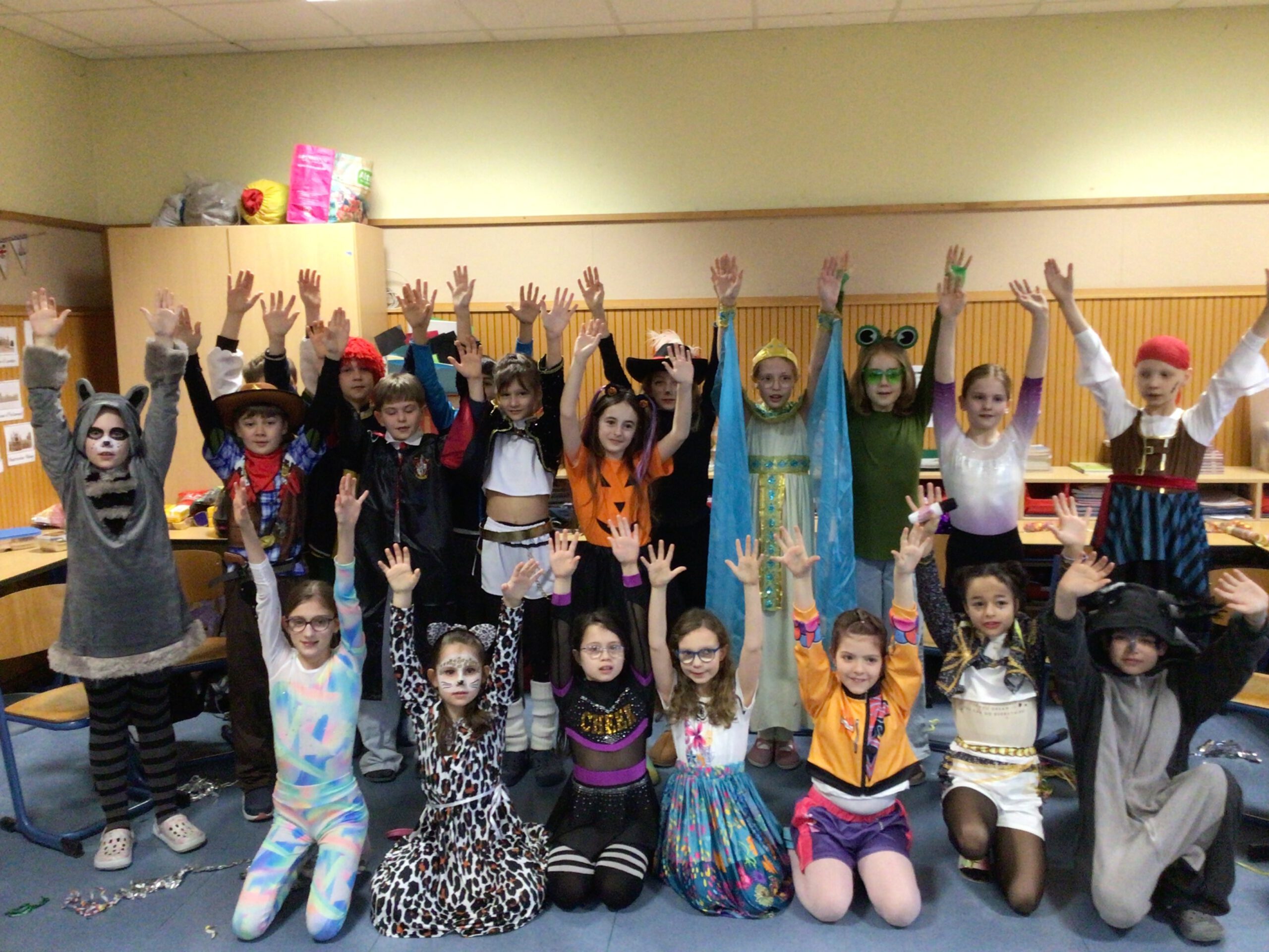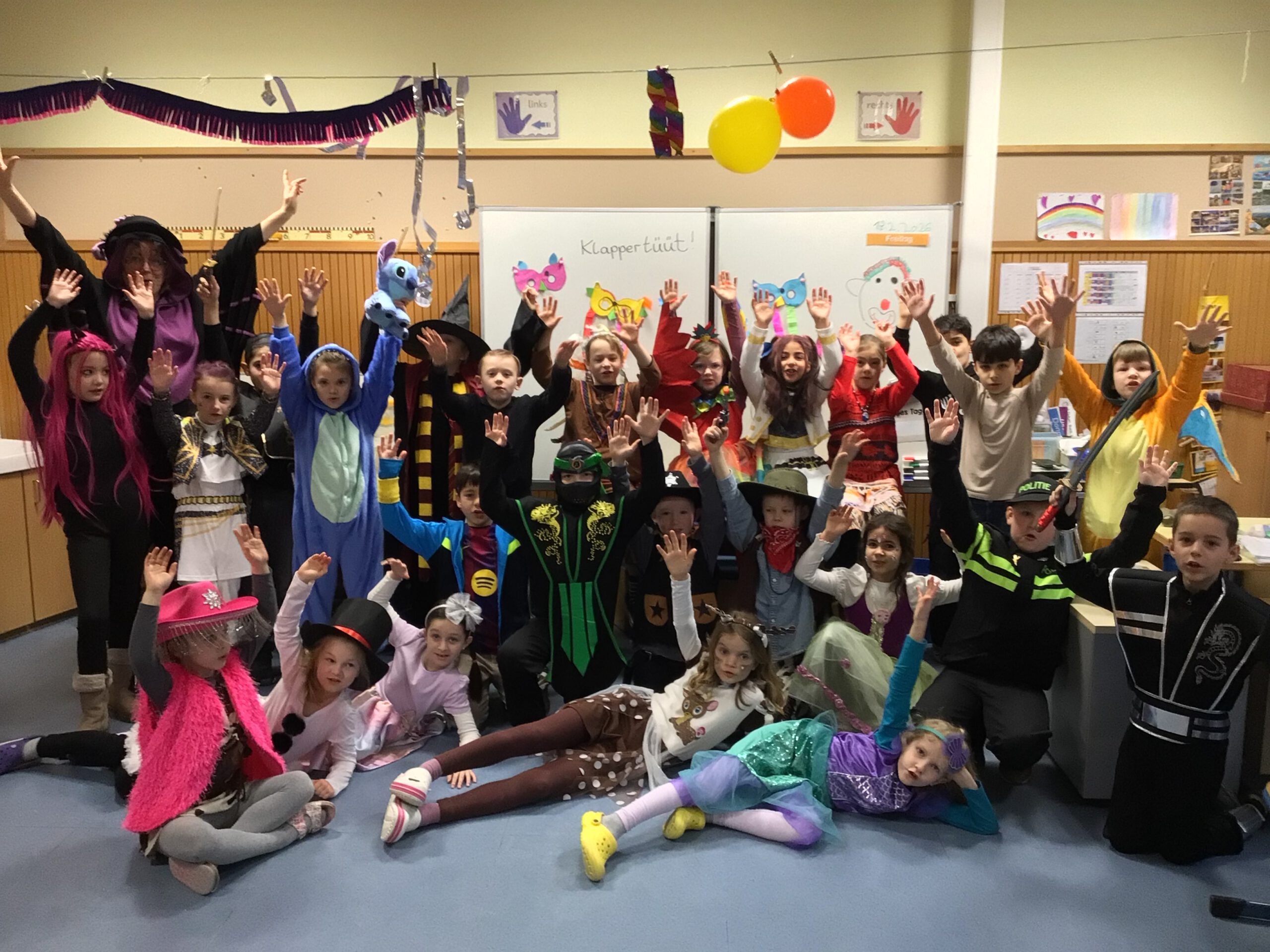 Der Karnevalstag startete traditionell in den Klassenräumen. Dort wurde gemeinsam gefrühstückt, gespielt, getanzt und gelacht. Bei Stopptanz, Reise nach Jerusalem und Kostüm-Modenschauen präsentierten die Kinder stolz ihre Verkleidungen. Auch die Lehrkräfte ließen sich nicht lumpen und erschienen in Kostümen.