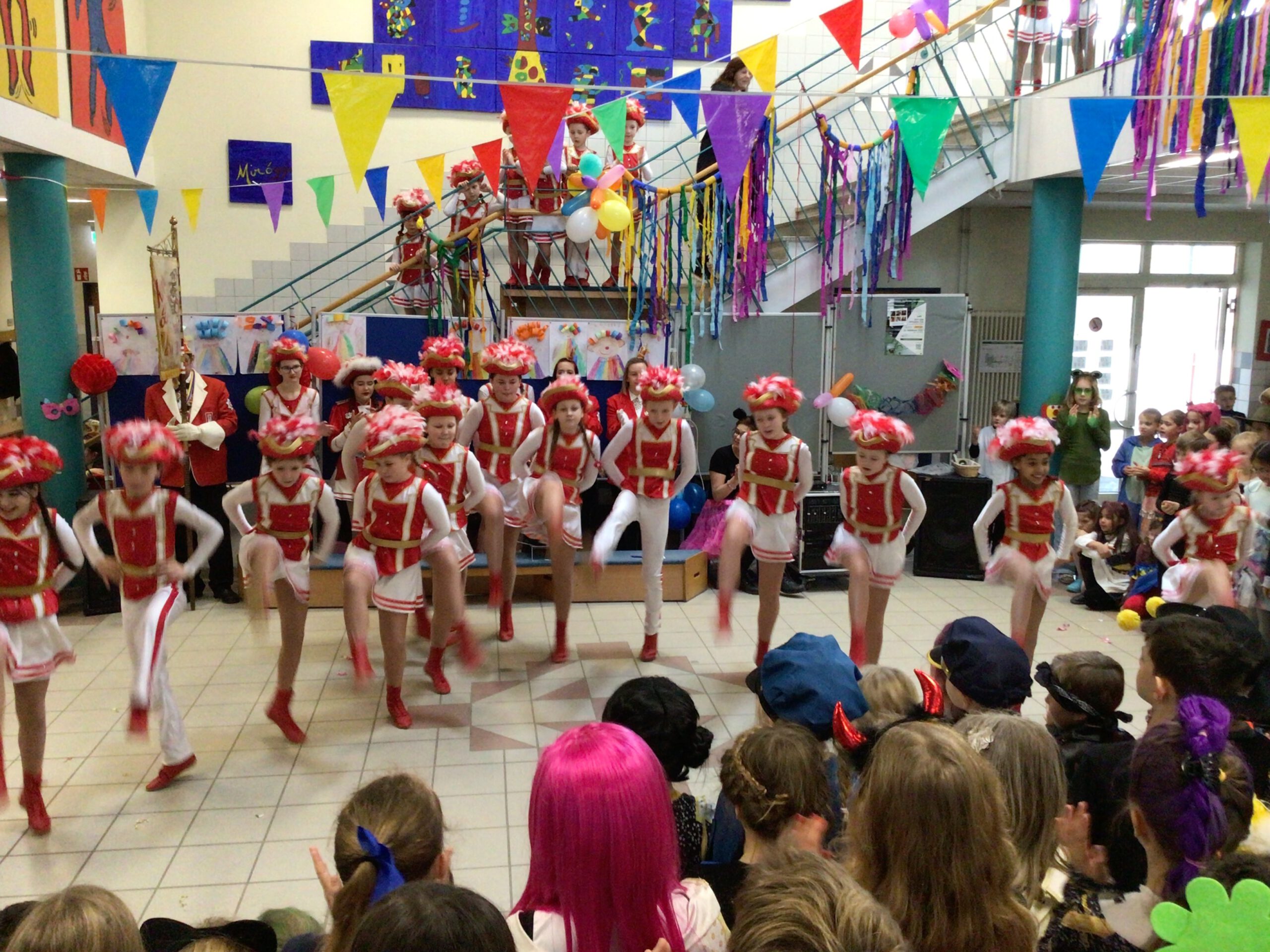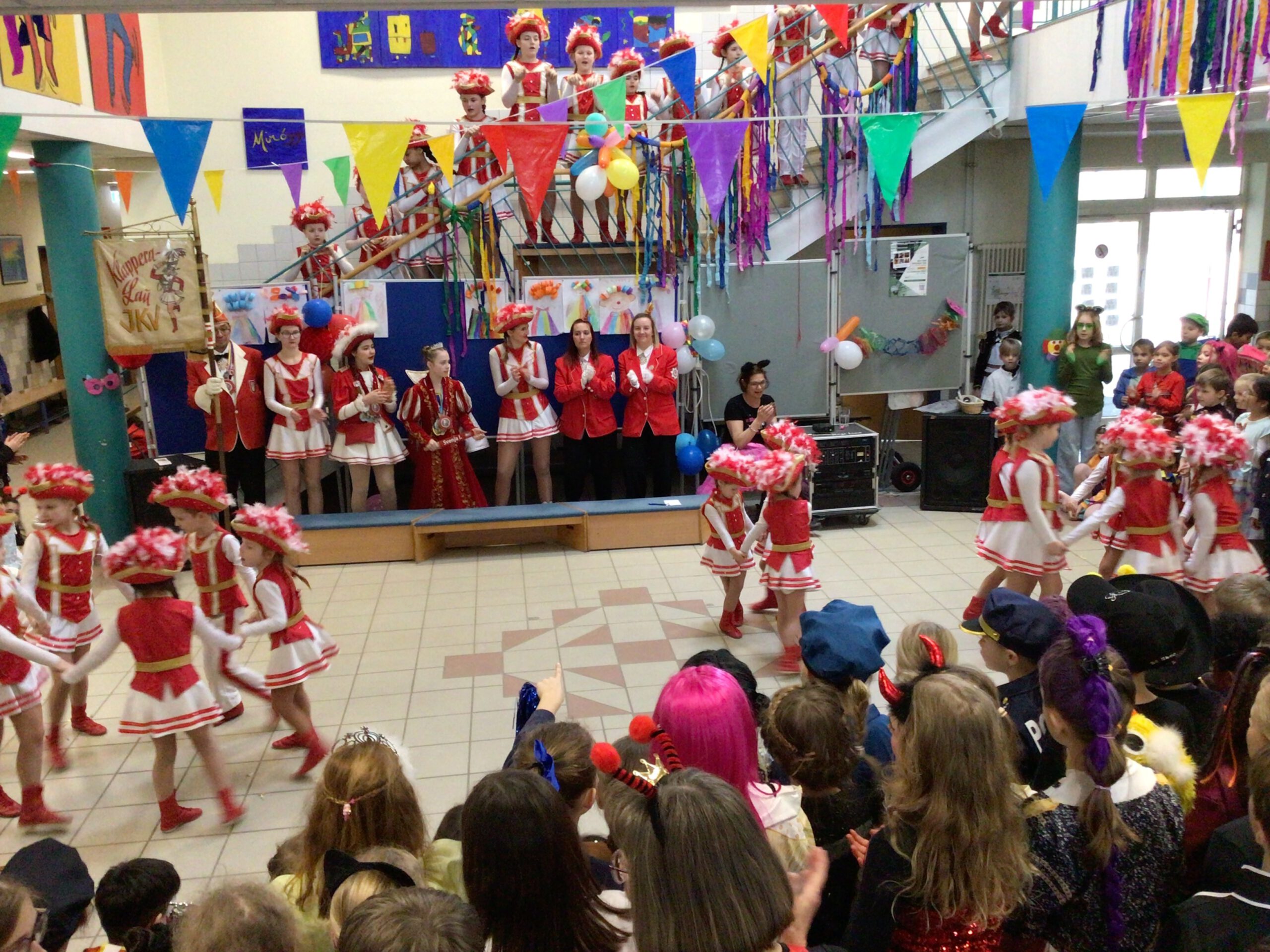 Ein erstes Highlight war die gemeinsame Polonäse durch das gesamte Schulgebäude. Im Anschluss versammelten sich alle im Forum. Dort erwartete uns ein besonderer Programmpunkt: Die Tönisvorster Kinderprinzessin Svenja I. kam mit ihrem Gefolge zu Besuch und sorgte mit Tänzen und Musik für ordentlich Stimmung.