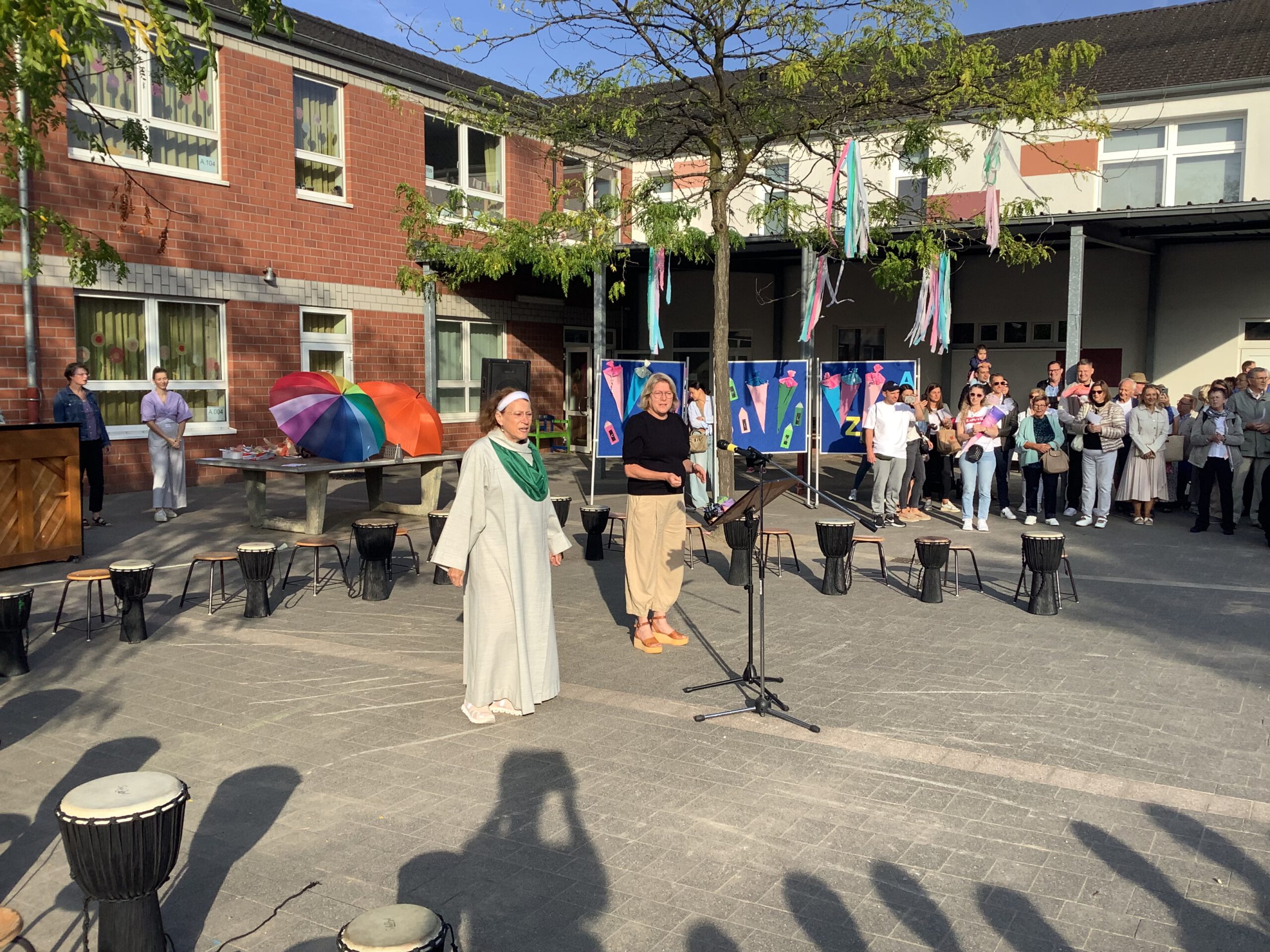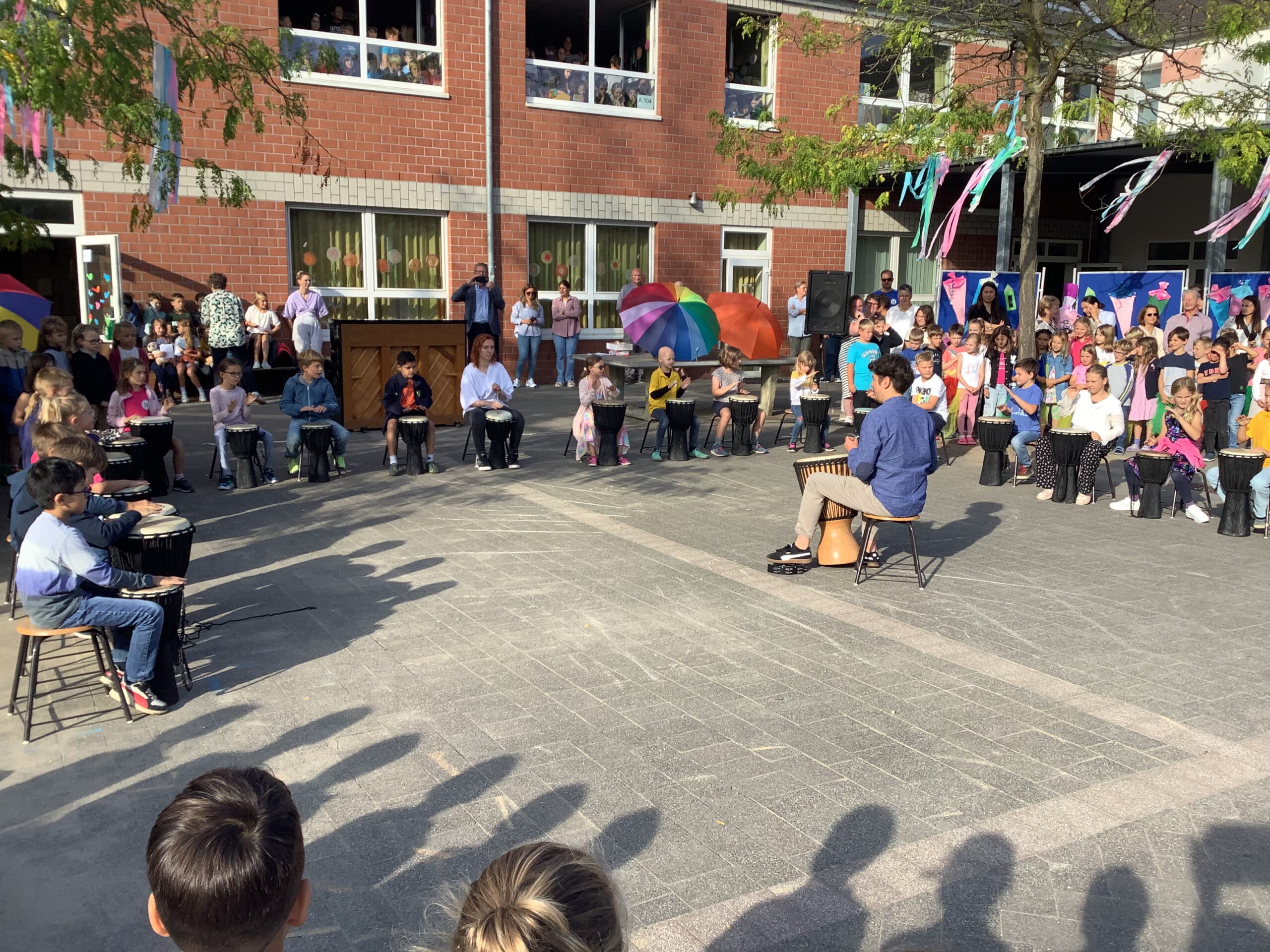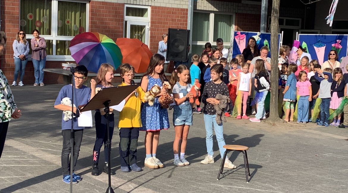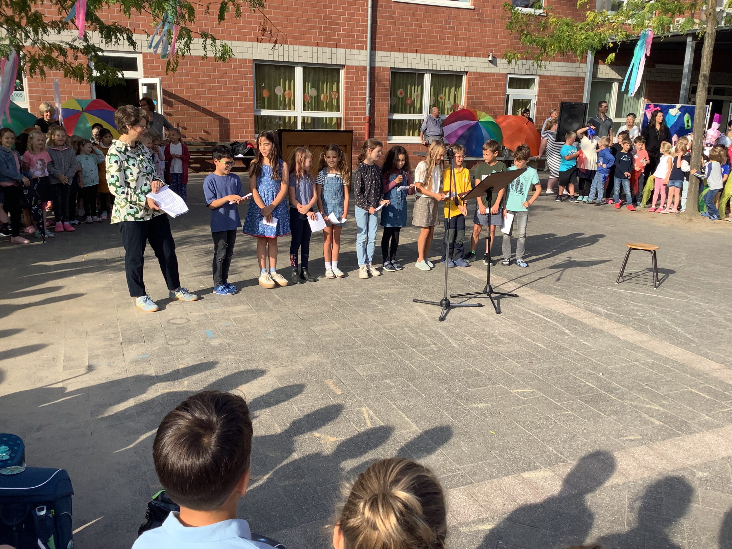 Am Donnerstag, den 22.08.2024 war es dann für unsere Erstklässler endlich so weit! Nach einem kurzen Gottesdienst auf dem Schulhof und einer stimmungsvollen Einschulungsfeier, unterstützt durch unsere Trommel-AG und den zweiten Klassen, durften alle ihre erste Schulstunde mit ihren neuen Mitschülern erleben. Dabei lernten sie auch ihre neuen Klassentiere, Tapi Tatze und Fledermaus Flo, kennen.