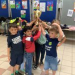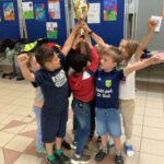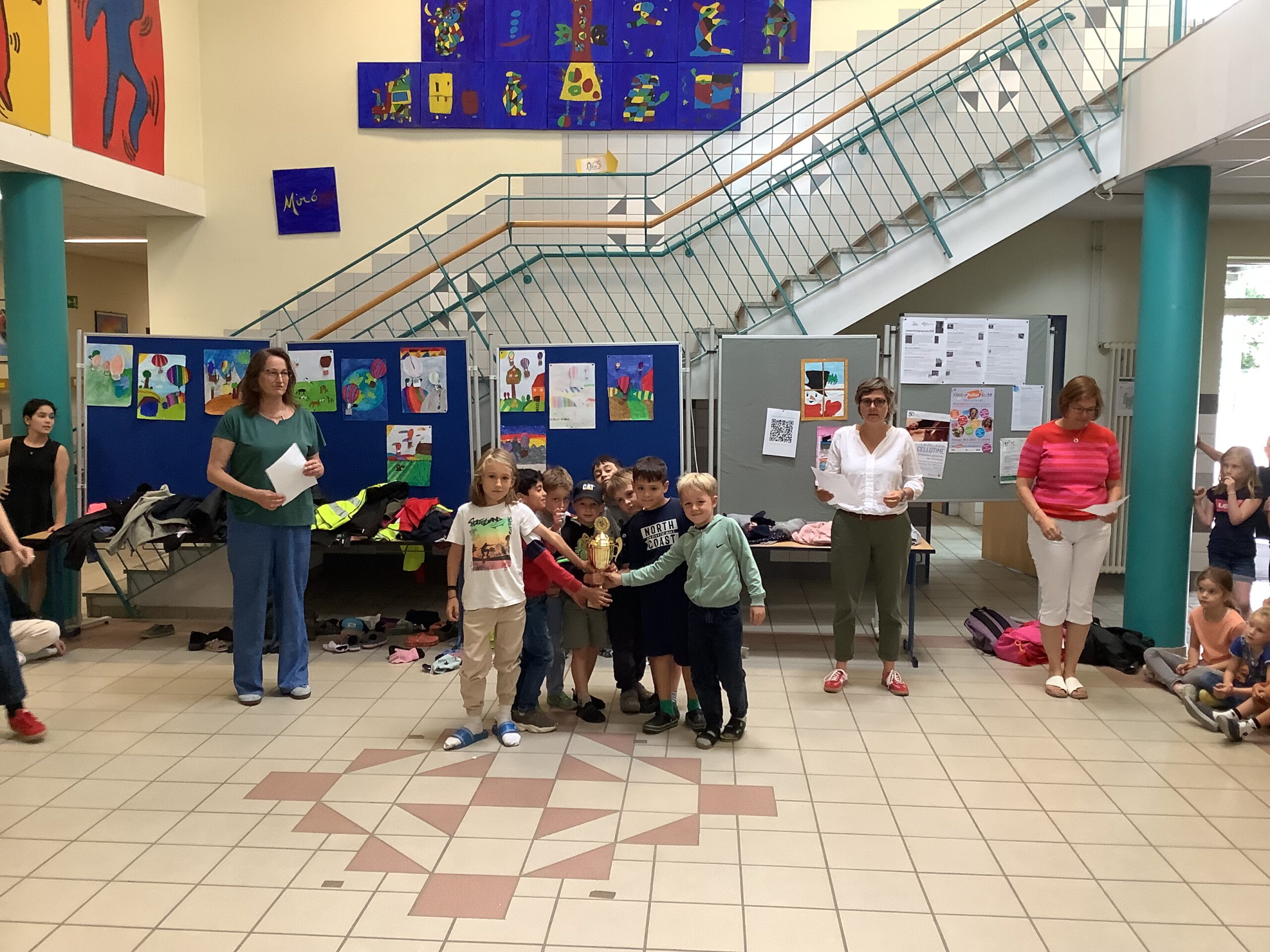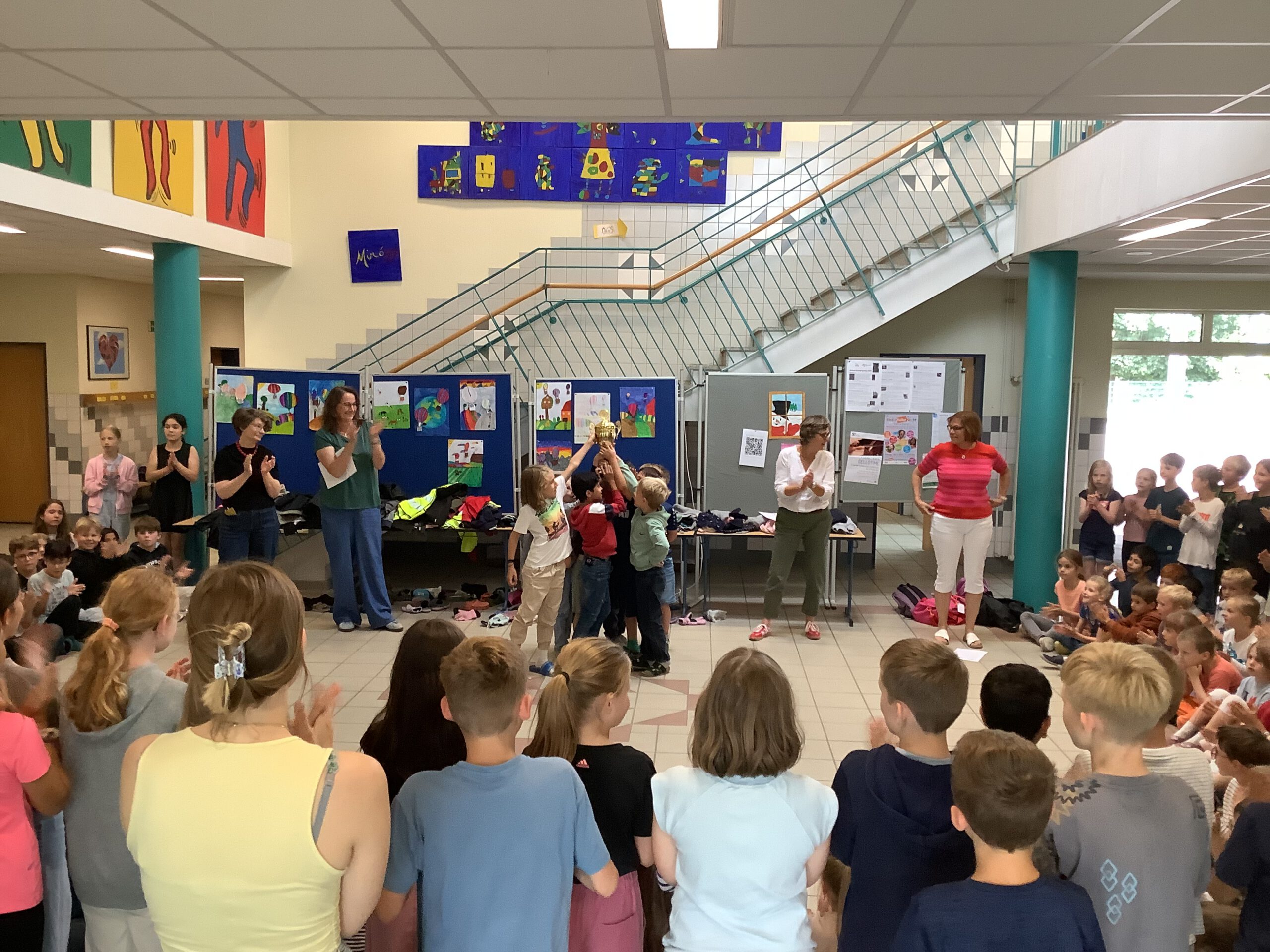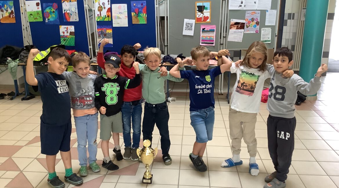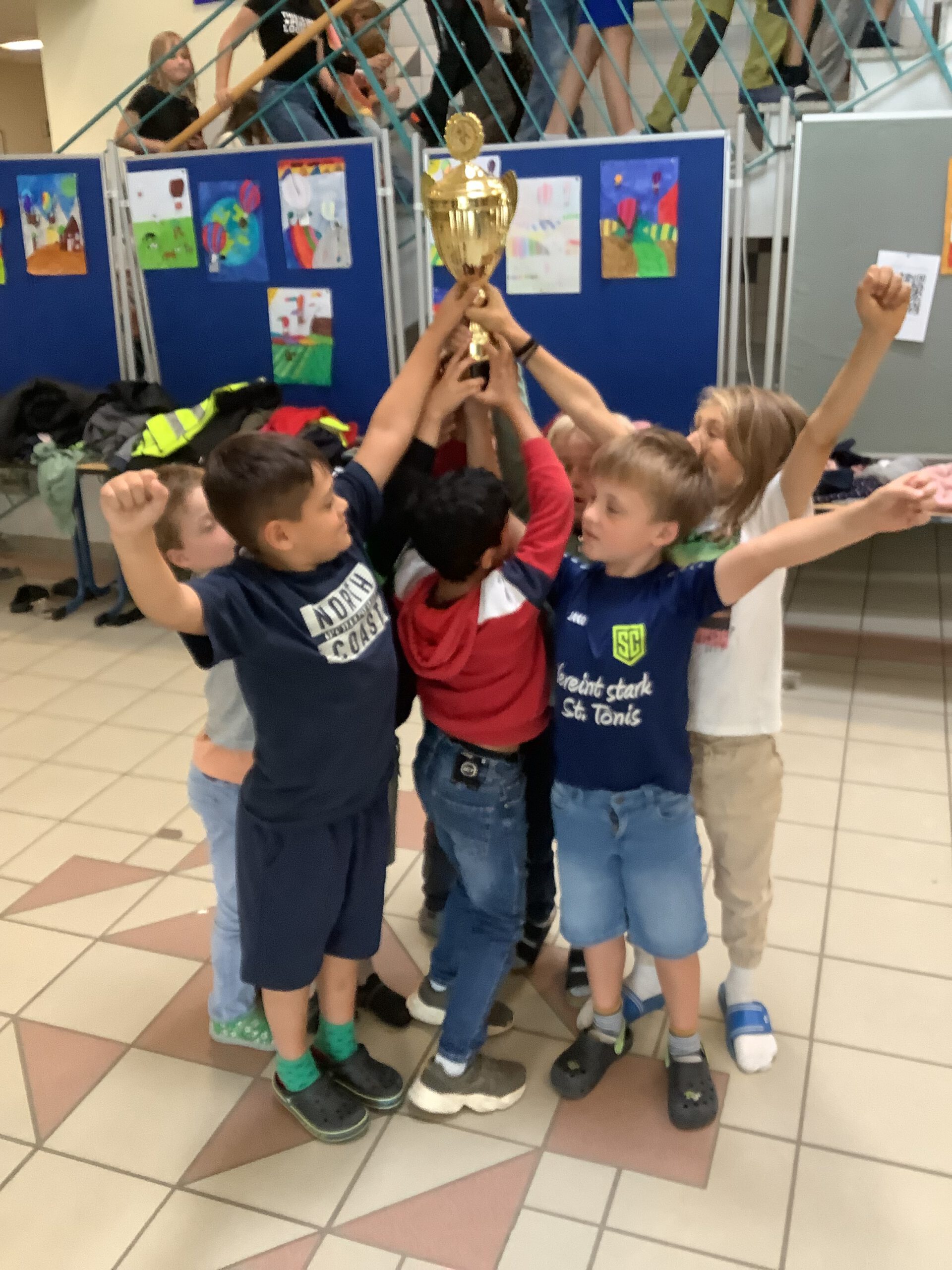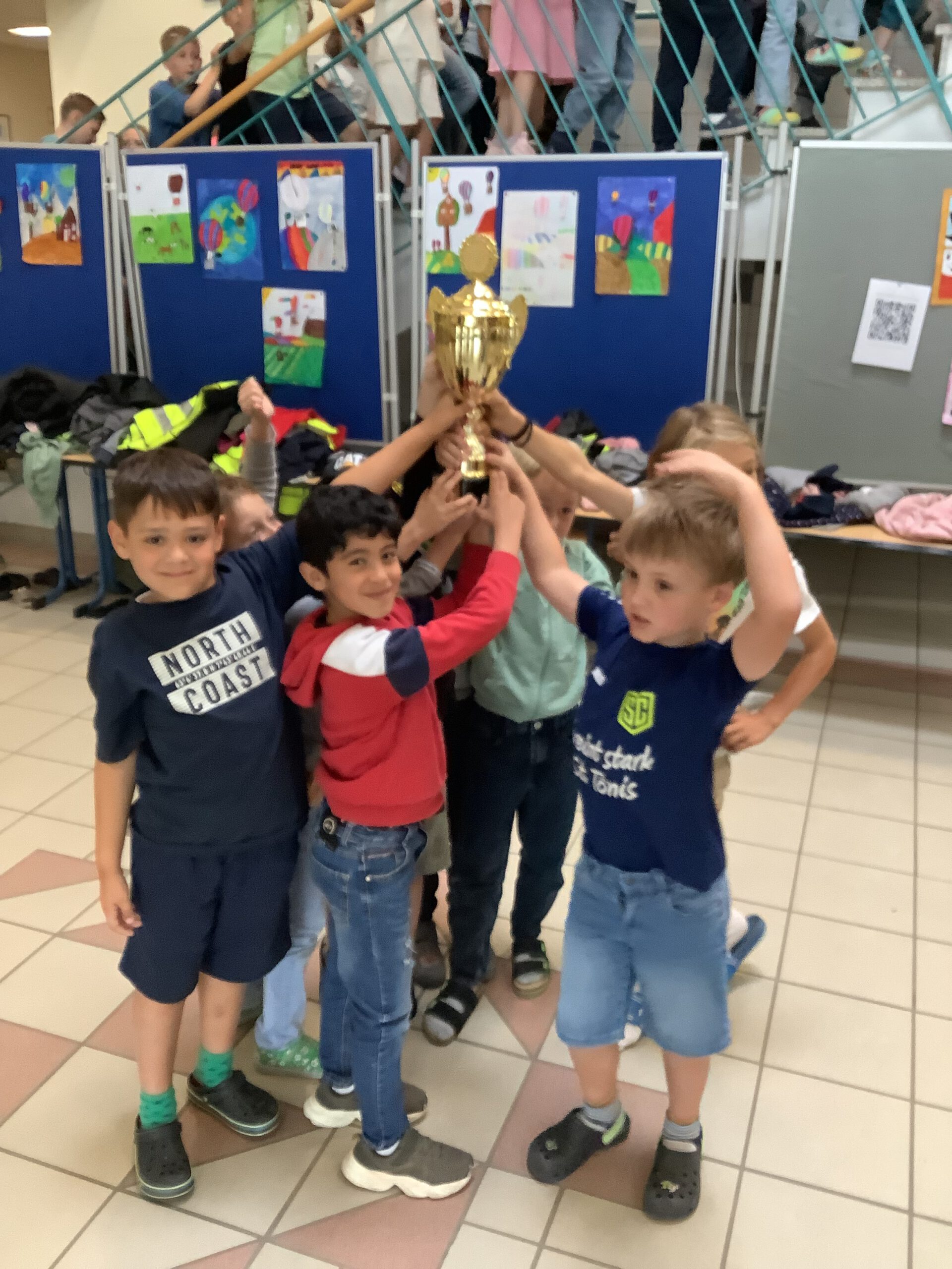 Diesmal erkämpfte sich die 1a den dritten Platz! Bei ungemütlichem und sehr nassem Wetter überstanden „Tapis Torjäger“ das Viertelfinale nach einer siegreichen Vorrunde knapp im Elfmeterschießen. Genauso knapp mussten sich unsere Erstklässler leider dann aber im Halbfinale im Elfmeterschießen geschlagen geben. Trotzdem sind alle stolz auf diesen Pokal.