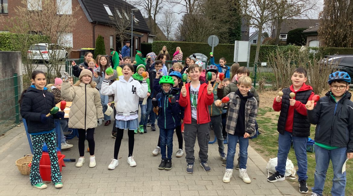 Einige Viertklässler begrüßten die vielen Fußgänger mit Rasseln und Krachmachern und händigten ihnen ihre Stempelkarte mit dem ersten erlaufenen Stempelbild aus!
